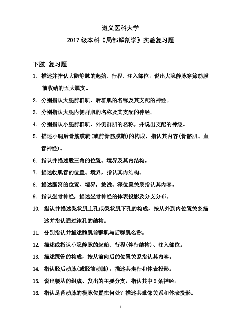 遵义医科大学2017级本科《局部解剖学》实验复习题下肢复习题1.描述并指认大隐静脉的起始、行程、注入部位,说出大隐静脉穿筛筋膜前收纳的五大属支。2.分别指认大腿前群肌、后群肌的名称及其支配的神经。3.分别指认大腿内侧群肌的名称及其支配的神经。4.分别指认小腿前群肌、外侧群肌的名称,并说出支配的神经。5.描述小腿后骨筋膜鞘(或前骨筋膜鞘)的构成,指认其内容(骨骼肌、血管神经)。6.指认并描述股三角的位置、境界及其内结构。7.描述收肌管的位置、境界,指认其内结构。8.描述胭窝的位置、境界,按浅、深位置关系指认其内容。9.指认坐骨神经,描述坐骨神经的体表投影及分支分布。10.指认并描述梨状肌上孔或梨状肌下孔的构成,按从外到内位置关系描述并指认通过该孔的结构。11.分别指认并描述髋肌前群肌与后群肌名称。12.描述或指认小隐静脉的起始、行程(伴行结构)、注入部位。13.描述踝管的构成,按从前向后的位置关系指认其内容。14.指认胫后动脉(或胫前动脉),描述其走行和体表投影。15.说出腰丛的组成、发出的主要分支,指认其中2条神经。16.指认足背动脉的摸脉位置在何处?描述其毗邻关系和体表投影。
