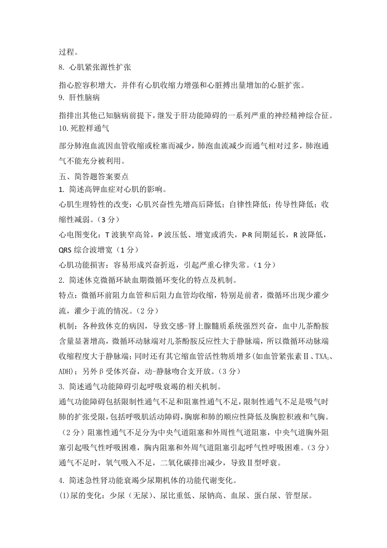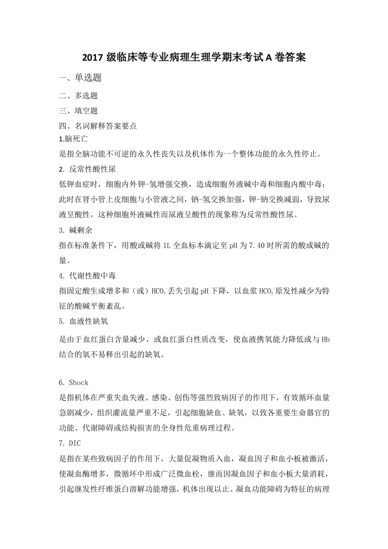 2017级临床等专业病理生理学期末考试A卷答案一、单选题二、多选题三、填空题四、名词解释答案要点1.脑死亡是指全脑功能不可逆的永久性丧失以及机体作为一个整体功能的永久性停止。2.反常性酸性尿低钾血症时,细胞内外钾-氢增强交换,造成细胞外液碱中毒和细胞内酸中毒:此时在肾小管上皮细胞与小管液之间,钠-氢交换加强,钾-钠交换减弱,导致尿液呈酸性,这种细胞外液碱性而尿液呈酸性的现象称为反常性酸性尿。3.碱剩余指在标准条件下,用酸或碱将1L全血标本滴定至pH为7.40时所需的酸或碱的量。4.代谢性酸中毒指固定酸生成增多和(或)HC0丢失引起pH下降,以血浆HC0原发性减少为特征的酸碱平衡紊乱。5.血液性缺氧是由于血红蛋白含量减少,或血红蛋白性质改变,使血液携氧能力降低或与b结合的氧不易释出引起的缺氧。6.Shock是指机体在严重失血失液、感染、创伤等强烈致病因子的作用下,有效循环血量急剧减少,组织灌流量严重不足,引起细胞缺血、缺氧,以致各重要生命器官的功能、代谢障碍或结构损害的全身性危重病理过程。7.DIC是指在某些致病因子的作用下,大量促凝物质入血,凝血因子和血小板被激活,使凝血酶增多,微循环中形成广泛微血栓,继而因凝血因子和血小板大量消耗,引起继发性纤维蛋白溶解功能增强,机体出现以止、凝血功能障碍为特征的病理