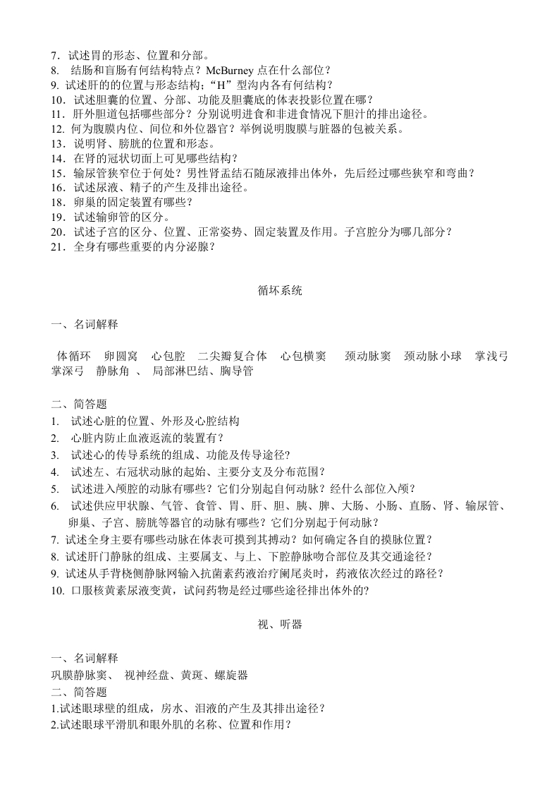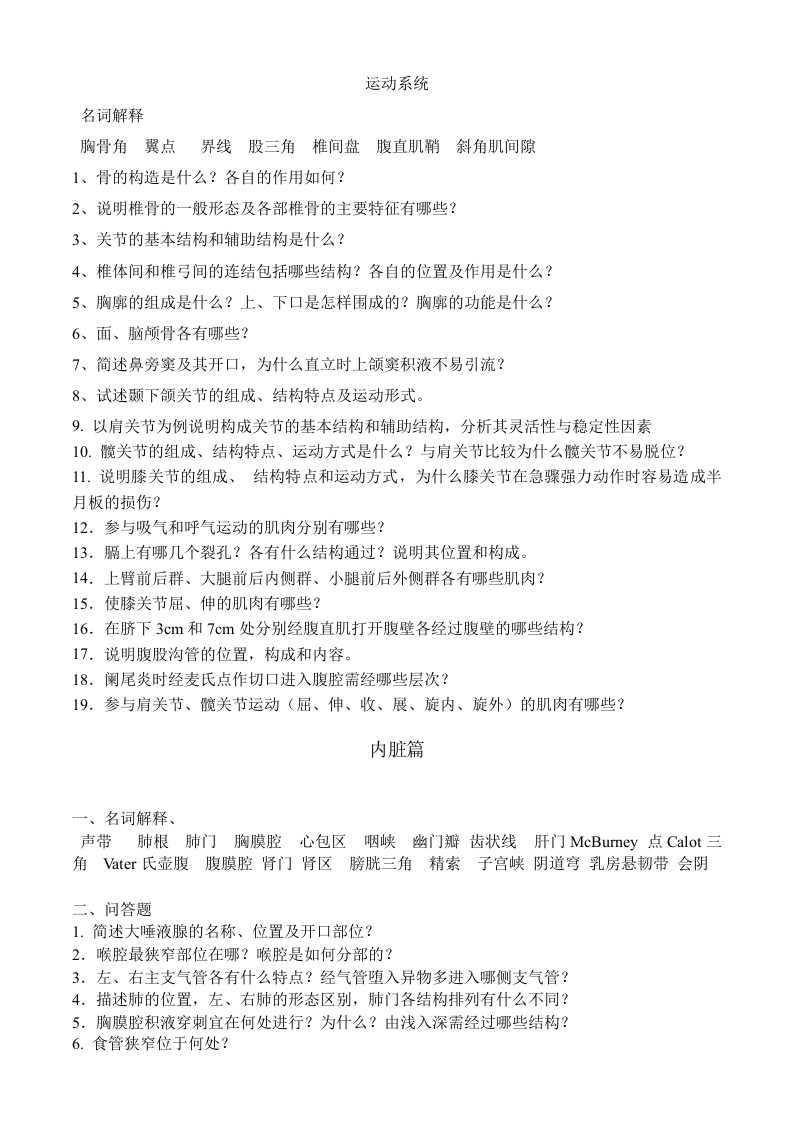 运动系统名词解释胸骨角翼点界线股三角椎间盘腹直肌鞘斜角肌间隙1、骨的构造是什么?各自的作用如何?2、说明椎骨的一般形态及各部椎骨的主要特征有哪些?3、关节的基本结构和辅助结构是什么?4、椎体间和椎弓间的连结包括哪些结构?各自的位置及作用是什么?5、胸廓的组成是什么?上、下口是怎样围成的?胸廓的功能是什么?6、面、脑颅骨各有哪些?7、简述鼻旁窦及其开口,为什么直立时上领窦积液不易引流?8、试述颞下颌关节的组成、结构特点及运动形式。9.以肩关节为例说明构成关节的基本结构和辅助结构,分析其灵活性与稳定性因素10.髋关节的组成、结构特点、运动方式是什么?与肩关节比较为什么髋关节不易脱位?11.说明膝关节的组成、结构特点和运动方式,为什么膝关节在急骤强力动作时容易造成半月板的损伤?12.参与吸气和呼气运动的肌肉分别有哪些?13.膈上有哪几个裂孔?各有什么结构通过?说明其位置和构成。14.上臂前后群、大腿前后内侧群、小腿前后外侧群各有哪些肌肉?15.使膝关节屈、伸的肌肉有哪些?16.在脐下3cm和7cm处分别经腹直肌打开腹壁各经过腹壁的哪些结构?17.说明腹股沟管的位置,构成和内容。18.阑尾炎时经麦氏点作切口进入腹腔需经哪些层次?19.参与肩关节、髋关节运动(屈、伸、收、展、旋内、旋外)的肌肉有哪些?内脏篇一、名词解释、声带肺根肺门胸膜腔心包区咽峡幽门瓣齿状线肝门McBurney点Calot三角atr氏壶腹腹膜腔肾门肾区膀胱三角精索子宫峡阴道穹乳房悬韧带会阴二、问答题1.简述大唾液腺的名称、位置及开口部位?2.喉腔最狭窄部位在哪?喉腔是如何分部的?3,左、右主支气管各有什么特点?经气管堕入异物多进入哪侧支气管?4.描述肺的位置,左、右肺的形态区别,肺门各结构排列有什么不同?5.胸膜腔积液穿刺宜在何处进行?为什么?由浅入深需经过哪些结构?6.食管狭窄位于何处?
