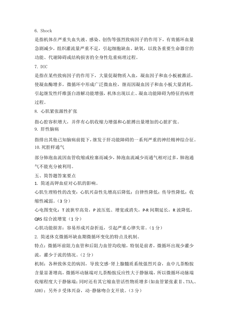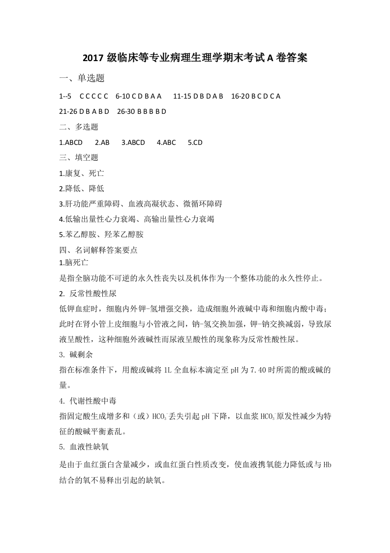 2017级临床等专业病理生理学期末考试A卷答案一、单选题1--5 CCCCC 6-10CDBAA11-15DBDAB 16-20BCDCA21-26 DBABD 26-30 BBB BD二、多选题1.ABCD2.AB3.ABCD4.ABC 5.CD三、填空题1.康复、死亡2.降低、降低3.肝功能严重障碍、血液高凝状态、微循环障碍4.低输出量性心力衰竭、高输出量性心力衰竭5苯乙醇胺、羟苯乙醇胺四、名词解释答案要点1.脑死亡是指全脑功能不可逆的永久性丧失以及机体作为一个整体功能的永久性停止。2.反常性酸性尿低钾血症时,细胞内外钾-氢增强交换,造成细胞外液碱中毒和细胞内酸中毒:此时在肾小管上皮细胞与小管液之间,钠-氢交换加强,钾-钠交换减弱,导致尿液呈酸性,这种细胞外液碱性而尿液呈酸性的现象称为反常性酸性尿。3.碱剩余指在标准条件下,用酸或碱将1L全血标本滴定至pH为7.40时所需的酸或碱的量。4.代谢性酸中毒指固定酸生成增多和(或)HCO丢失引起pH下降,以血浆HC0,原发性减少为特征的酸碱平衡紊乱。5.血液性缺氧是由于血红蛋白含量减少,或血红蛋白性质改变,使血液携氧能力降低或与b结合的氧不易释出引起的缺氧。