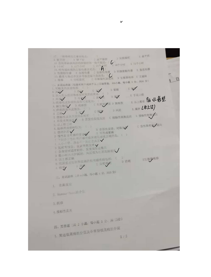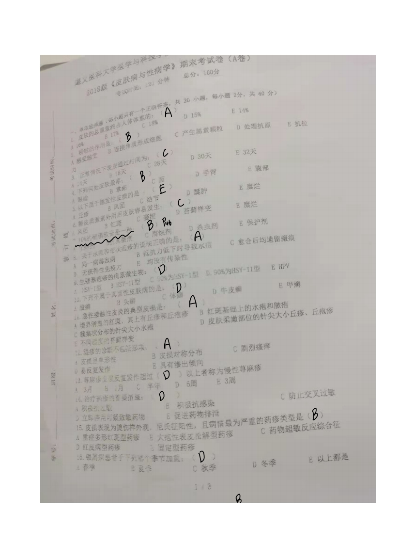 建义实#入学医学与科我《0以8家《之洗房与华满学》期卡考试卷《A卷)考试阅:,20分钟总分:1C0分共20小题,每小题2分,共40分)、每小有一个正A上皮发的总丽票约古人体体露的:D15%E14%C18%D处理抗原B抗拉817W部的作用是马C产生箫颗粒:连接角质形成细胞4器受应凳CE32天3正况下皮通这间为:D30天28天8天D手背E腹部《下列何反最停:A天BED鬟肿E糜烂5以下于器发皮的A限B风园C结反质激素外用后皮肤容易发生D苔薛样变E魔烂E保护剂划风3红B脚腐烟剂杀虫剂杂:关于爪和常疹的说法正确的是AB孤抗力低下时导致不痘C愈合后均遗留瘢痕A同一病每数病E均没有传染性)无获德准免疫刀DD.90%为HSV-I1型E HPV9生夏希疱疹的病原微生物%为SY-1型15-1型3S-7型以.下列不属于真墓性反肤病的是:0D牛皮润E甲海B头:急在楼触性皮炎的典型皮肉是:A红斑基础上的水疱和脓疱4境界清楚的红凝,其上有丘疹和丘瘦疹BD皮肤柔嫩部位的针尖大小丘疹、丘疱疹C簇桌状分布的针尖大小水泡不同运家的芦军样变2,证疹的诊断不茫那AC剧烈瘙痒4皮预是单形图反损对称分布具有渗出倾向日勿反复发作以,年原渗皮损反复发作超过0以上者称为慢性尊麻疹13月6:月C半年D6周E3周4,治疗西修的首受酒滋:DC防止交又过敏A积假L8积设抗感染)立即高方可疑致最药物61.皮损表现为烫伤岸外观,尼氏征阳性,且病情曼为严重的药疹类型是(乃促选药物排河A重症多形红天型药疹日大逼性表反沦解型药窗药物超敏反应综合征CD红反病型药疹国足型药疹6银属保思堂于。1季节加三:0E以上都是:查季巴爱C秋季D冬季1439