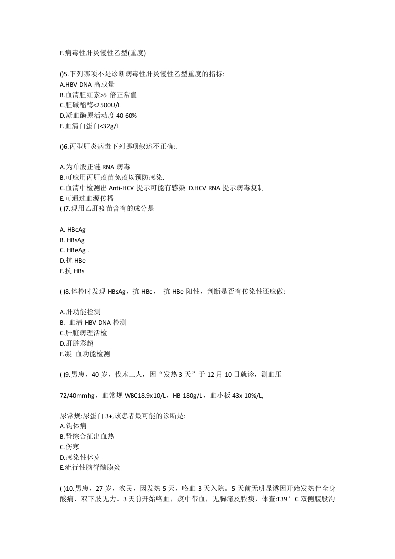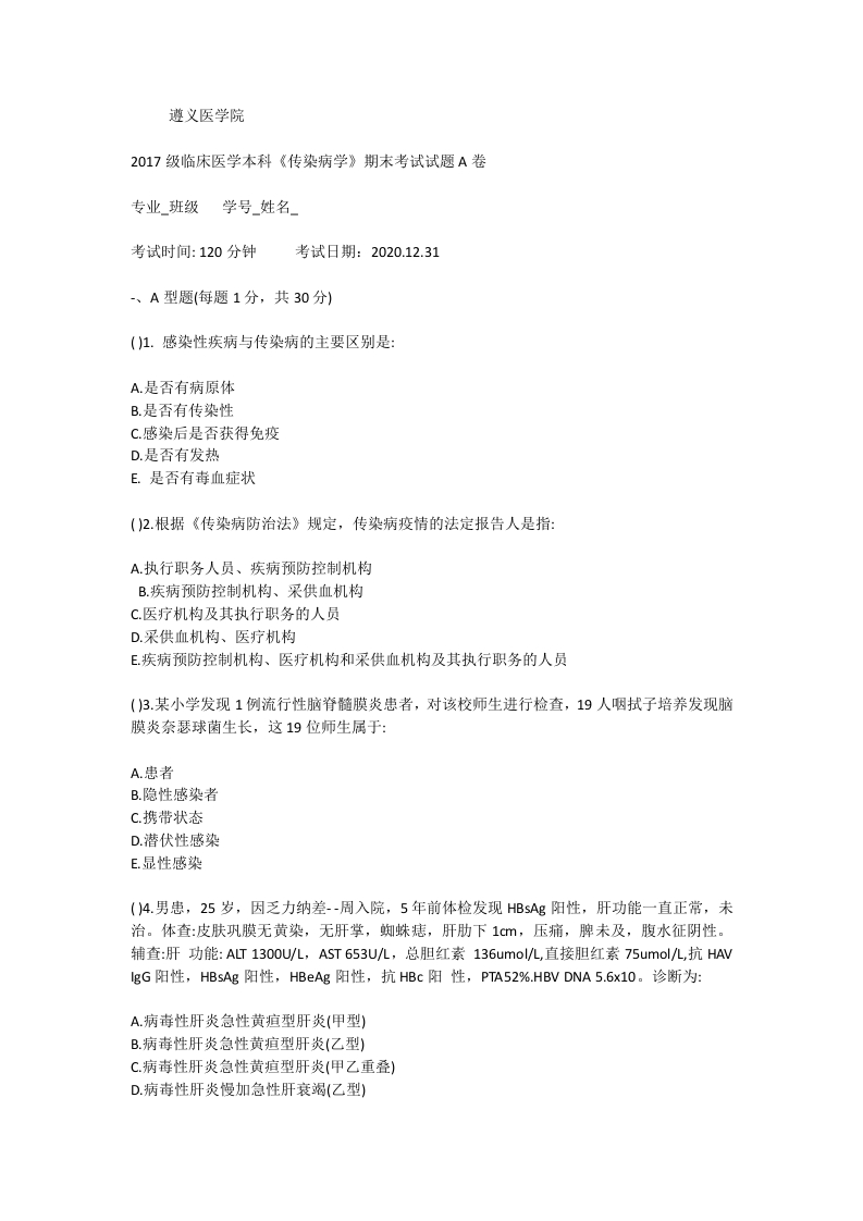 遵义医学院2017级临床医学本科《传染病学》期末考试试题A卷专业班级学号姓名考试时间:120分钟考试日期:2020.12.31-、A型题(每题1分,共30分】()1.感染性疾病与传染病的主要区别是:A.是否有病原体B.是否有传染性C.感染后是否获得免疫D.是否有发热E.是否有毒血症状()2根据《传染病防治法》规定,传染病疫情的法定报告人是指:A.执行职务人员、疾病预防控制机构B.疾病预防控制机构、采供血机构C医疗机构及其执行职务的人员D.采供血机构、医疗机构E疾病预防控制机构、医疗机构和采供血机构及其执行职务的人员()3.某小学发现1例流行性脑脊髓膜炎患者,对该校师生进行检查,19人咽拭子培养发现脑膜炎奈瑟球菌生长,这19位师生属于:A.患者B.隐性感染者C携带状态D.潜伏性感染E显性感染(4.男患,25岁,因乏力纳差--周入院,5年前体检发现HBsAg阳性,肝功能一直正常,未治。体查:皮肤巩膜无黄染,无肝掌,蜘蛛痣,肝肋下1cm,压痛,脾未及,腹水征阴性。辅查:肝功能:ALT1300U/L,AST653U/L,总胆红素136umol/L,直接胆红素75umol/L,抗HAVIgG阳性,HBsAg阳性,HBeAg阳性,抗HBc阳性,PTA52%.HBV DNA5.6x10。诊断为:A病毒性肝炎急性黄疸型肝炎(甲型)B.病毒性肝炎急性黄疸型肝炎(乙型)C病毒性肝炎急性黄疸型肝炎(甲乙重叠)D.病毒性肝炎慢加急性肝衰竭(乙型)