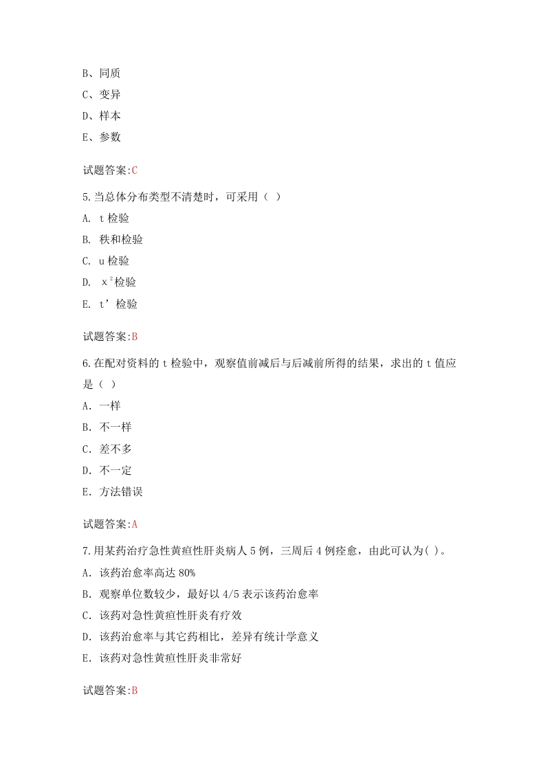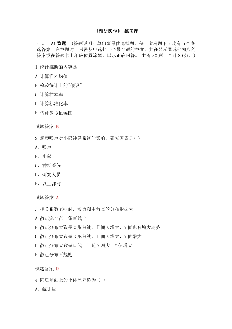 《预防医学》练习题一、A1型题(答题说明:单句型最佳选择题。每一道考题下面均有五个备选答案。在答题时,只需从中选择一个最合适的答案,并在显示器选择相应的答案或在答题卡上相应位置涂黑,以示正确回答。共有80题,合计80分。)1.统计推断的内容是A.计算样本均值B.检验统计上的“假设C.计算样本率D.计算标准化率E.估计参考值范围试题答案:B2.观察噪声对小鼠神经系统的影响,研究因素是()。A、噪声B、小鼠C、神经系统D、研究人员E、以上都对试题答案:A3.相关系数r>0时,散点图中散点的分布形态为A.散点完全在一条直线上B.散点分布大致呈C形曲线,且随X增大,Y值也有增大趋势C.散点分布大致呈S形曲线,且随X增大,Y值增大D.散点分布大致呈直线,且随X增大,Y值增大E.散点分布不规则试题答案:D4.同质基础上的个体差异称为()A、统计量