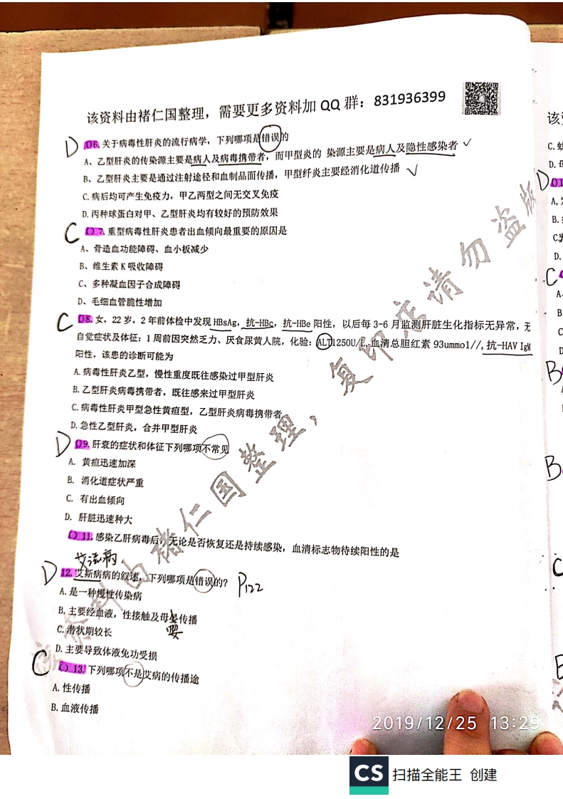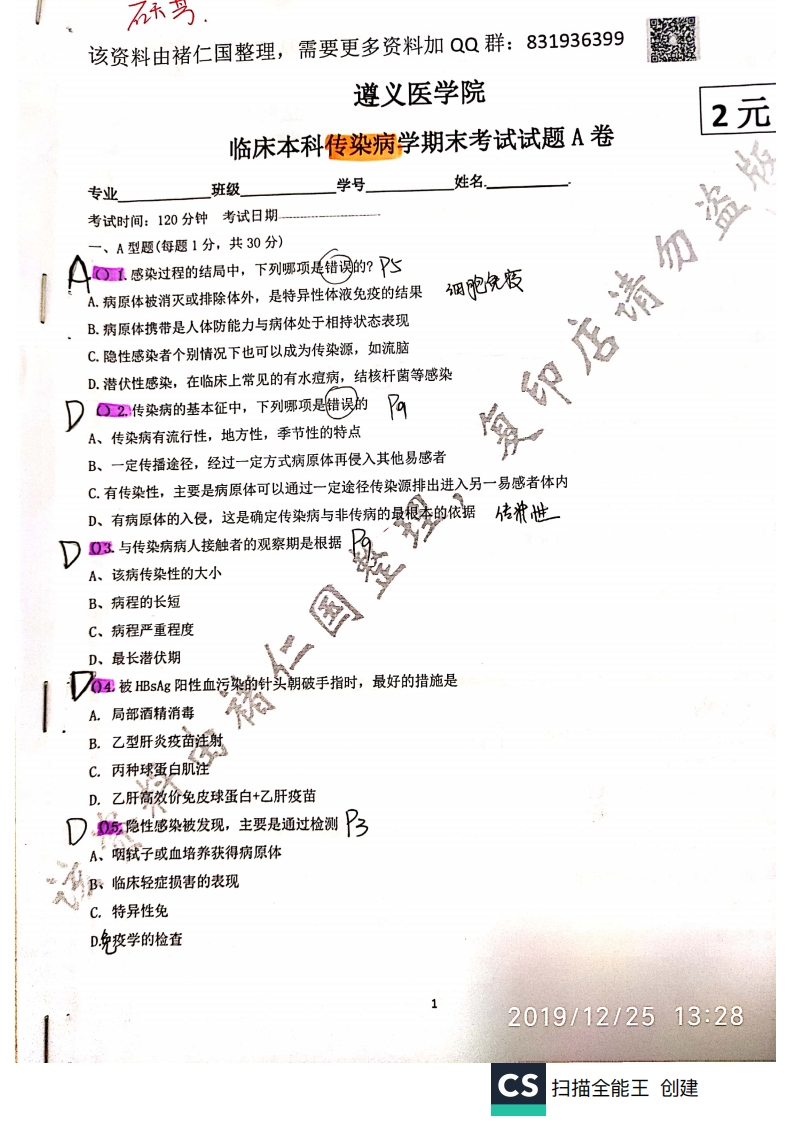 该资料由褚仁国整理,需要更多资料加QQ群:831936399遵义医学院2元临床本科传染病学期末考试试题A卷姓名专业班级学号考试时间:120分钟考试日期一、A型题(每题1分,共30分)0感染过程的结局中,下列哪项是错的?心A.病原体被消灭或排除体外,是特异性体液免疫的结果细胞免疫B.病原体携带是人体防能力与病体处于相持状态表现C.隐性感染者个别情况下也可以成为传染源,如流脑D.潜伏性感染,在临床上常见的有水痘病,结核杆菌等感染DO2传染病的基本征中,下列哪项是错误的%复印店请勿盗A、传染病有流行性,地方性,季节性的特点B、一定传播途径,经过一定方式病原体再侵入其他易感者C.有传染性,主要是病原体可以通过一定途径传染源排出进入另一易感者体内、有病原体的入侵,这是确定传染病与非传病的最根本的依据传浓世DQ3与传染病病人接触者的观察期是根据、该病传染性的大小B、病程的长短C、病程严重程度最长潜伏期A4被BsAg阳性血污染的针头朝破手指时,最好的措施是A.局部酒精消毒B.乙型肝炎疫苗注射C.丙种球蛋白肌注D.乙肝高效价免皮球蛋白+乙肝疫苗D5隐性B染被发现,主要是通过检测A、咽轼子或血培养获得病原体临床轻症损害的表现C.特异性免D晚变学的检查2019/12/2513:28cs扫描全能王创建