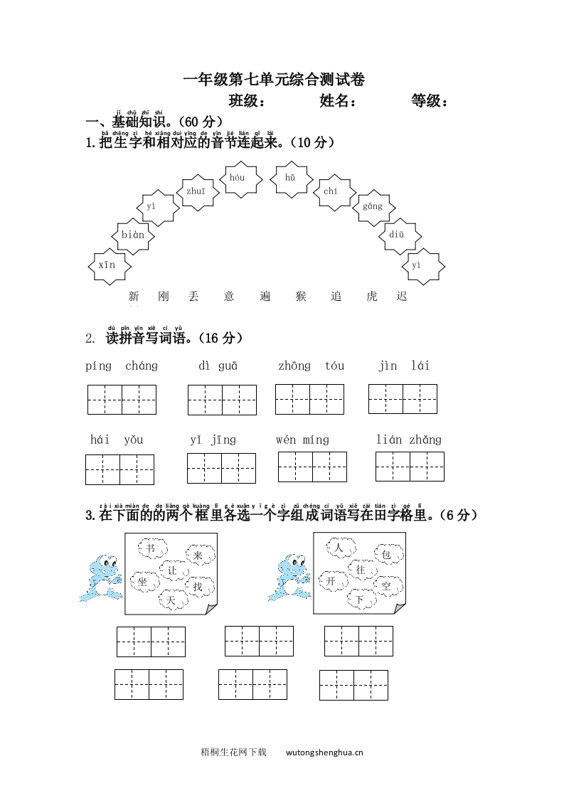一年级第七单元综合测试卷班级:姓名:等级:一、基陆知识。(60分)1.把笙学和箱对逻的普韩莲起来。(10分)子之新刚丢意遍猴追虎迟2.读拼音笃词语。(16分)pingchangdi guazhongtóujin laihaiyǒuyi jingwen minglian zhang3.茬卡面的的满术框里客选'个学组箴词语驾在留学格里。(6分)书包让找·开天下梧桐生花网下载wutongshenghua.cn
