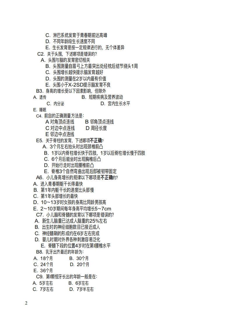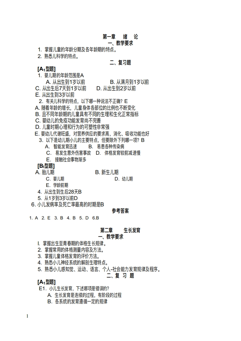 第一章绪论一、教学要求1.掌握儿童的年龄分期及各年龄期的特点。2.熟悉儿科学的特点。二、复习题[A型题]1.婴儿期的年龄范围是AA.从出生到1岁以前B.从满月到1岁以前C.从出生后7天到1岁以前D.从出生到2岁以前E.从出生到3岁以前2.有关儿科学的特点,以下哪一种说法不正确?EA.随着年龄的增长,儿童身体各部位的比例也不断变化B.且不同年龄期的儿童具有不同的生理和生化正常指标C.婴幼儿的免疫功能发育尚不完善D.儿童时期心理和行为的可塑性排常强E.婴幼儿代谢旺盛,对营养供应的要求高,消化、吸收功能也好3.以下是幼儿期小儿的主要特点,但要除外下列哪一项?BA.智能发育迅速B.易患各种传染病C.易发生意外伤害事故D.体格发育较前减速慢E.接触社会事物渐多[B型题]A.胎儿期B.新生儿期C.婴儿期D.幼儿期E.学龄前期4.从出生到生后28天B5.从1岁到3岁以前D6.小儿发病率及死亡率最高的时期是B参考答案1.A2.E3.B4.B5.D6.B第二章生长发育一、教学要求1.掌握出生至青春期的体格生长规律。2.掌握常用的体格测量内容及方法。3.掌握儿童体格发育的评价方法。4.熟悉小儿神经系统的解剖生理特点。5.熟悉小)儿感知觉、运动、语言、个人-社会能力发育规律及程序。二、复习题[A1型题]E1.小儿生长发育,下述哪项是错误的?A.生长发育是连续的过程,有阶段的过程B.各系统的发育遵循一定的规律1