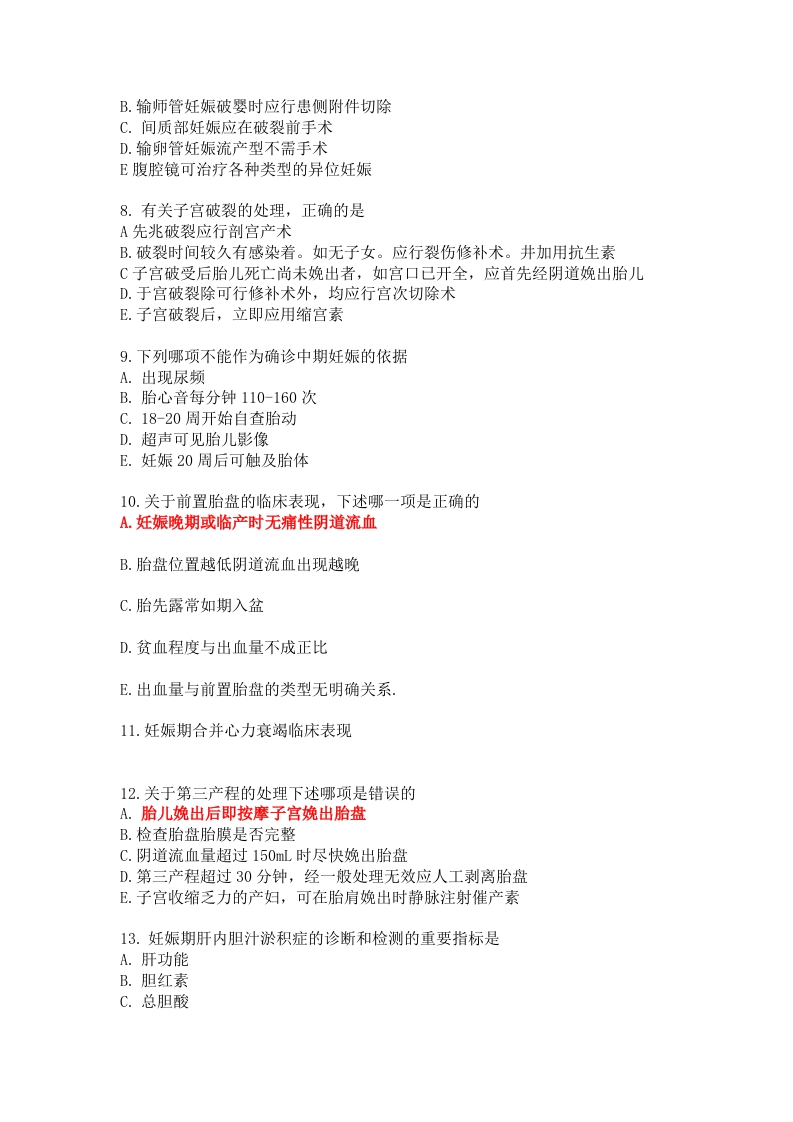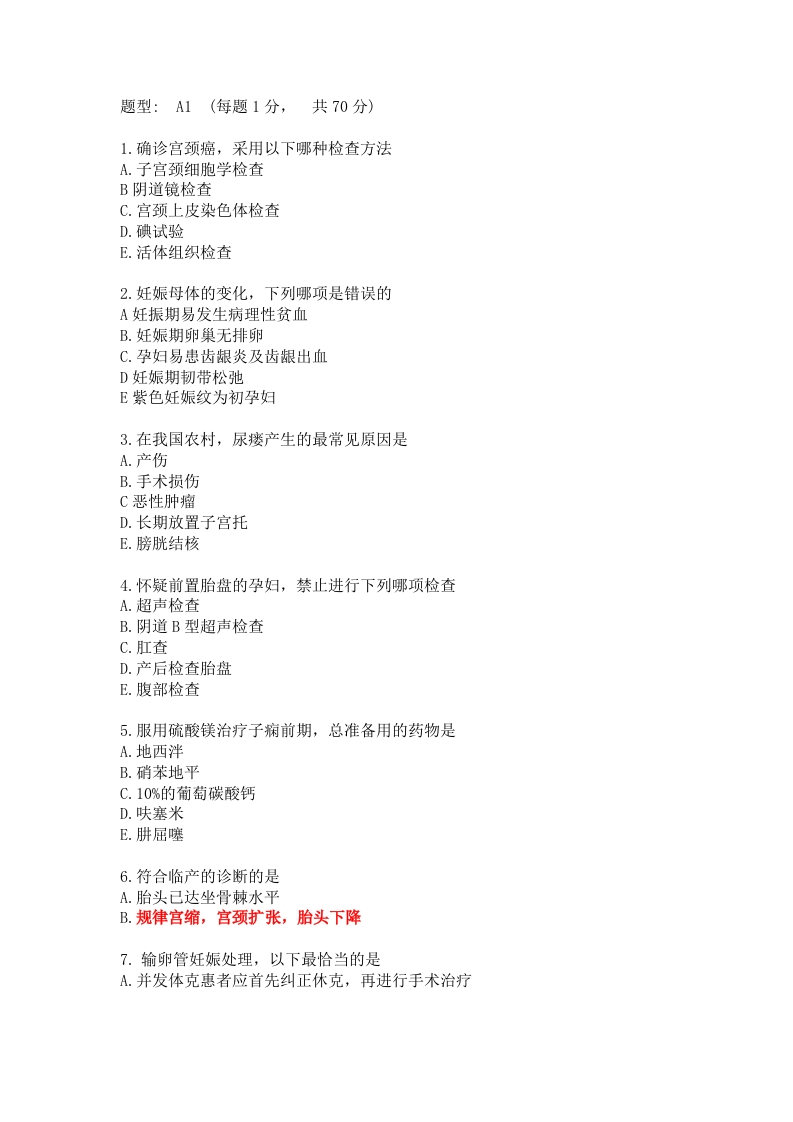 题型:A1(每题1分,共70分)1.确诊宫颈癌,采用以下哪种检查方法A.子宫颈细胞学检查B阴道镜检查C.宫颈上皮染色体检查D.碘试验E.活体组织检查2.妊娠母体的变化,下列哪项是错误的A妊振期易发生病理性贫血B.妊娠期卵巢无排卵C.孕妇易患齿龈炎及齿龈出血D妊娠期韧带松弛E紫色妊娠纹为初孕妇3.在我国农村,尿瘘产生的最常见原因是A.产伤B.手术损伤C恶性肿瘤D.长期放置子宫托E.膀胱结核4.怀疑前置胎盘的孕妇,禁止进行下列哪项检查A.超声检查B.阴道B型超声检查C.肛查D.产后检查胎盘E.腹部检查5.服用硫酸镁治疗子痫前期,总准备用的药物是A.地西泮B.硝苯地平C.10%的葡萄碳酸钙D.呋塞米E.肼屈噻6.符合临产的诊断的是A.胎头已达坐骨棘水平B.规律宫缩,宫颈扩张,胎头下降7.输卵管妊娠处理,以下最恰当的是A.并发体克惠者应首先纠正休克,再进行手术治疗
