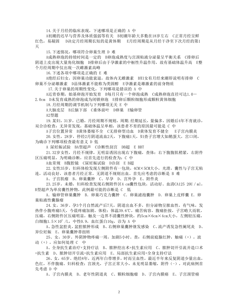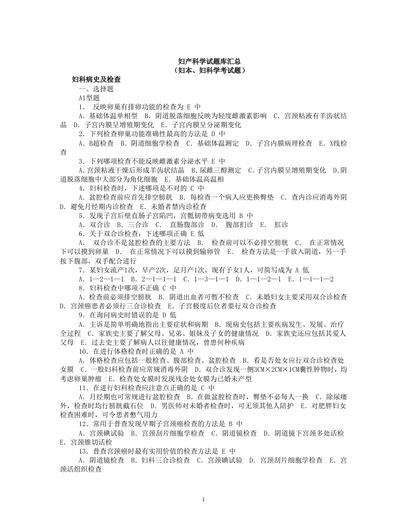妇产科学试题库汇总(妇本、妇科学考试题)妇科病史及检查一、选择题A1型题1.反映卵巢有排卵功能的检查为E中A,基础体温单相型B.阴道脱落细胞反映为轻度雌激素影响C.宫颈粘液有羊齿状结晶D.子宫内膜呈增殖期变化E.子宫内膜呈分泌期变化2.下列检查卵巢功能准确性最高的方法是D中A.B超检查B.阴道细胞学检查C.基础体温测定D.子宫内膜病理检查E.X线检查3.下列哪项检查不能反映雕激素分泌水平E中A.宫颈粘液干燥后形成羊齿状结晶B.尿雌三醇测定C.子宫内膜呈增殖期变化D.阴道脱落细胞中大部分为角化细胞E.基础体温高温相4.妇科检查时,下述哪项是不对的C中A.盆腔检查前应首先排空膀胱B.每检查一个病人应更换臀垫C.查内诊应消毒外阴D.避免月经期内诊检查E.未婚者禁内诊检查5.发现子宫后壁直肠子宫陷凹,宫骶韧带病变选用B中A.双合诊B.三合诊C.直肠腹部诊D.腹部扪诊E.肛诊6.关于双合诊检查,下述哪项正确E低A.双合诊不是盆腔检查的主要方法B.检查前可以不必排空膀胱C.在正常情况下可以摸到卵巢D.在正常情况下可以摸到输卵管E.检查方法是一手放入阴道,另一手按下腹部,双手配合进行7.某妇女流产1次,早产2次,足月产1次,现有子女1人,可简写成为A低A.1-2-1-1B.2-1-1-1C.1-3-1-1D.1-1-2-1E.1-1-1-28.妇科检查中哪项不正确C中A,检查前必须排空膀胱B.阴道出血者可暂不检查C.未婚妇女主要采用双合诊检查D.宫颈癌患者必须行三合诊检查E.子宫极度后位者要行双合诊检查9.在询问病史时错误的是D低A.主诉是简单明确地指出主要症状和病期B.现病史包括主要疾病发生、发展、治疗全过程C.家族史主要了解父母、兄弟、姐妹及子女的健康情况D.家族史还应包括其爱人父母E.过去史主要了解病人以往健康情况,曾患何种疾病10.在进行体格检查时正确的是A中A.体格检查应包括一般检查、腹部检查、盆腔检查B.看是否处女应行双合诊检查处女膜C.一般妇科检查前应常规消毒外阴D.双合诊发现一侧3C2CM×1C囊性肿物时,均考虑卵巢肿瘤E.检查处女膜时发现残余处女膜为己婚未产型11.在进行妇科检查应注意点正确的是C中A.月经期也可常规进行盆腔检查B.在做盆腔检查时,臀垫不必每人一换C.除尿瘘外,检查时均行膀胱截石位D.男医师对未婚者检查时,可无须其他人陪护E.对肥胖妇女检查困难时,可令患者憋气用力12.常用于普查发现早期子宫颈癌检查的方法是B中A.宫颈碘试验B.宫颈刮片细胞学检查C.阴道镜检查D.阴道镜下宫颈多处活检E.宫颈锥切活检13.普查宫颈癌时最有实用价值的检查方法是E中A.阴道镜检查B.妇科三合诊检查C.宫颈碘试验D.宫颈刮片细胞学检查E.宫颈活组织检查