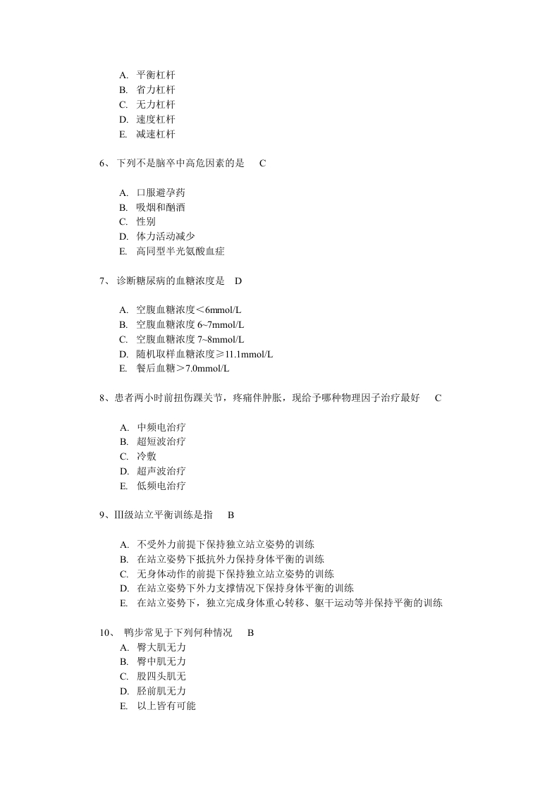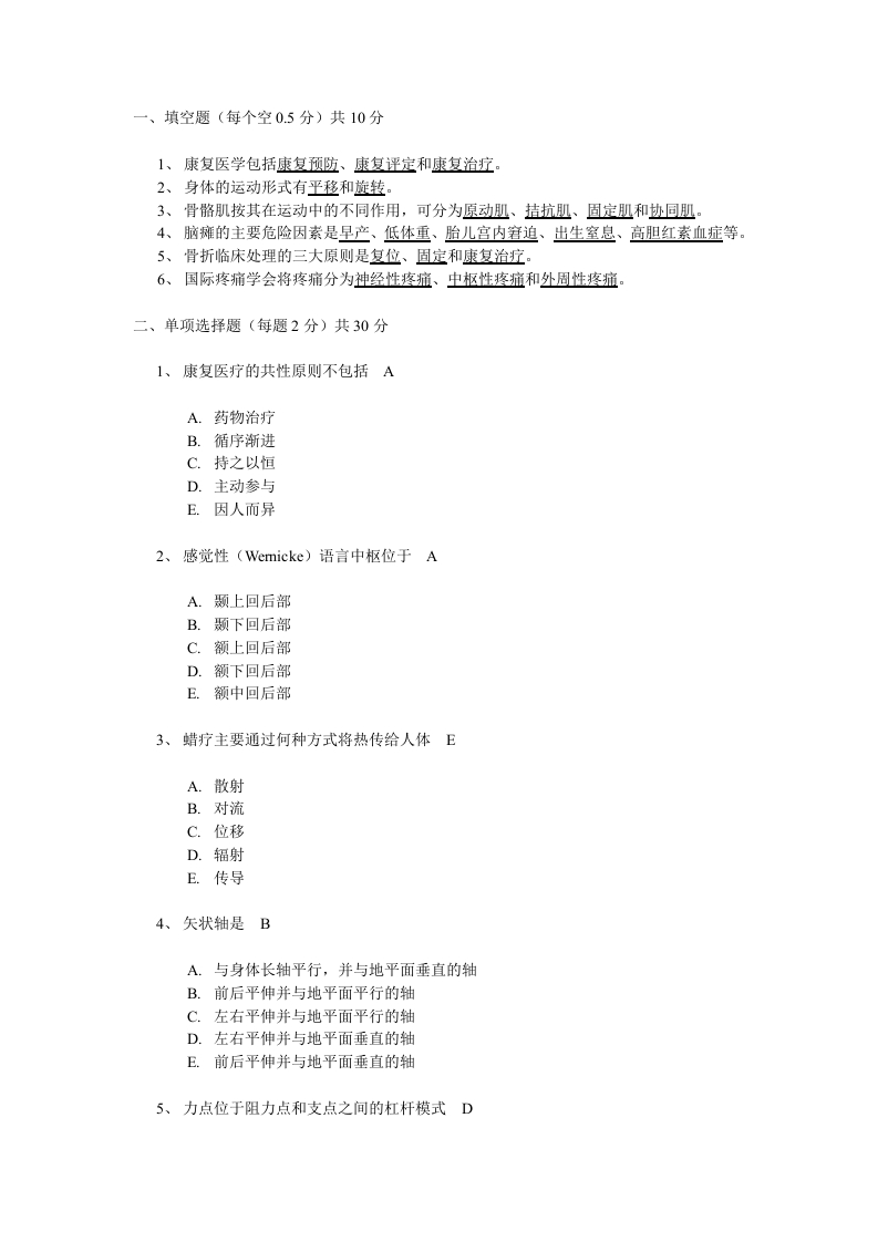 一、填空题(每个空0.5分)共10分1、康复医学包括康复预防、康复评定和康复治疗2、身体的运动形式有平移和旋鞋。3、骨骼肌按其在运动中的不同作用,可分为原动肌、拮抗肌、固定肌和协同肌:4、脑瘫的主要危险因素是早产、低体重、胎儿宫内窘迫、出生室息、高胆红素血症等。5、骨折临床处理的三大原则是复位、固定和康复治疗6、国际疼痛学会将疼痛分为神经性疼痛、中枢性疼痛和外周性疼痛。二、单项选择题(每题2分)共30分1、康复医疗的共性原则不包括AA.药物治疗B.循序渐进C.持之以恒D.主动参与E.因人而异2、感觉性(Wemicke)语言中枢位于AA.颢上回后部B.颗下回后部C.额上回后部D.额下回后部E.额中回后部3、蜡疗主要通过何种方式将热传给人体EA.散射B.对流C.位移D.辐射E.传导4、矢状轴是BA.与身体长轴平行,并与地平面垂直的轴B.前后平伸并与地平面平行的轴C.左右平伸并与地平面平行的轴D.左右平伸并与地平面垂直的轴E.前后平伸并与地平面垂直的轴5、力点位于阻力点和支点之间的杠杆模式D
