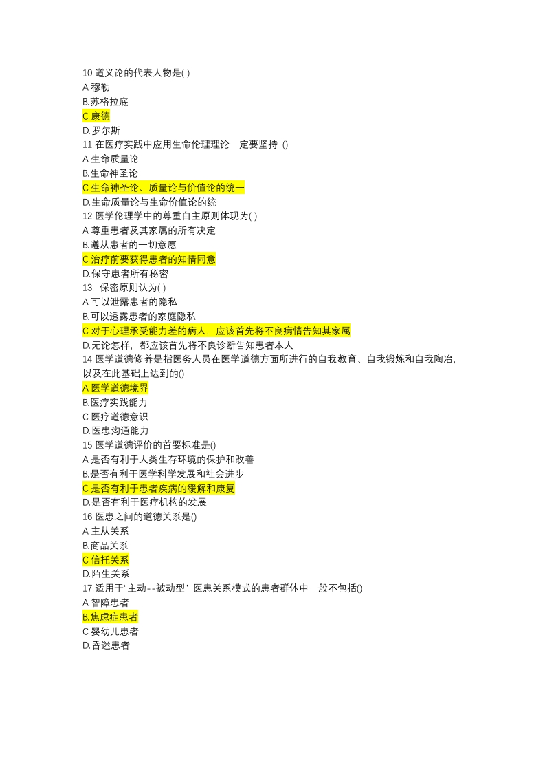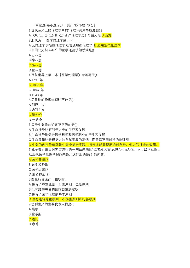 一、单选题(每小题2分,共计35小题70分)】1,现代意义上的伦理学中的"伦理”-词最早应源自()A《礼记。乐记》B.《东西洋伦理学史》C,蔡元培D.西方2般认为,医学伦理学属于0A元伦理学B.描述伦理学C,普通规范伦理学D应用规范伦理学3.中国公元前476年的医学道德认知模式是0A己-患B.神-患C巫-患D.医--患4.目前世界上第一本《医学伦理学》专著写于0A1791年B.1803年C.1847年D.1948年5.后果论的伦理学理论不包括0A利已主义B.功利主义C德性论D.公益论6关于生命论的论述不正确的是()A生命神圣论有利于人类的生存和发展B,生命神圣论促进医学科学和医学职业的产生和发展C,生命质量论是根据人的自然素质的高低,而采取不同对待的伦理观D.生命的内在价值就是生命中尚未实现,将来才能显现出的对自身、他人和社会的效用。7孔子曾引用当时南方流行的一句话来表达"仁者爱人"的思想:“人而无恒,不可以作巫医”。从现代医学伦理学理论来说,这体现的是()的内容。A医学美德论B.医学义务论C,医学后果论D,生命神圣论8医生行使医疗干预权时A违背了尊重原则、行善原则、仁爱原则B.没有维护患者的医疗自主决定权C,违背了医学伦理的基本原则D.没有违背尊重原则、不伤害原则和行善原则9.功利主义的主要代表人物是()A培根B.霍布斯C边沁D.康德