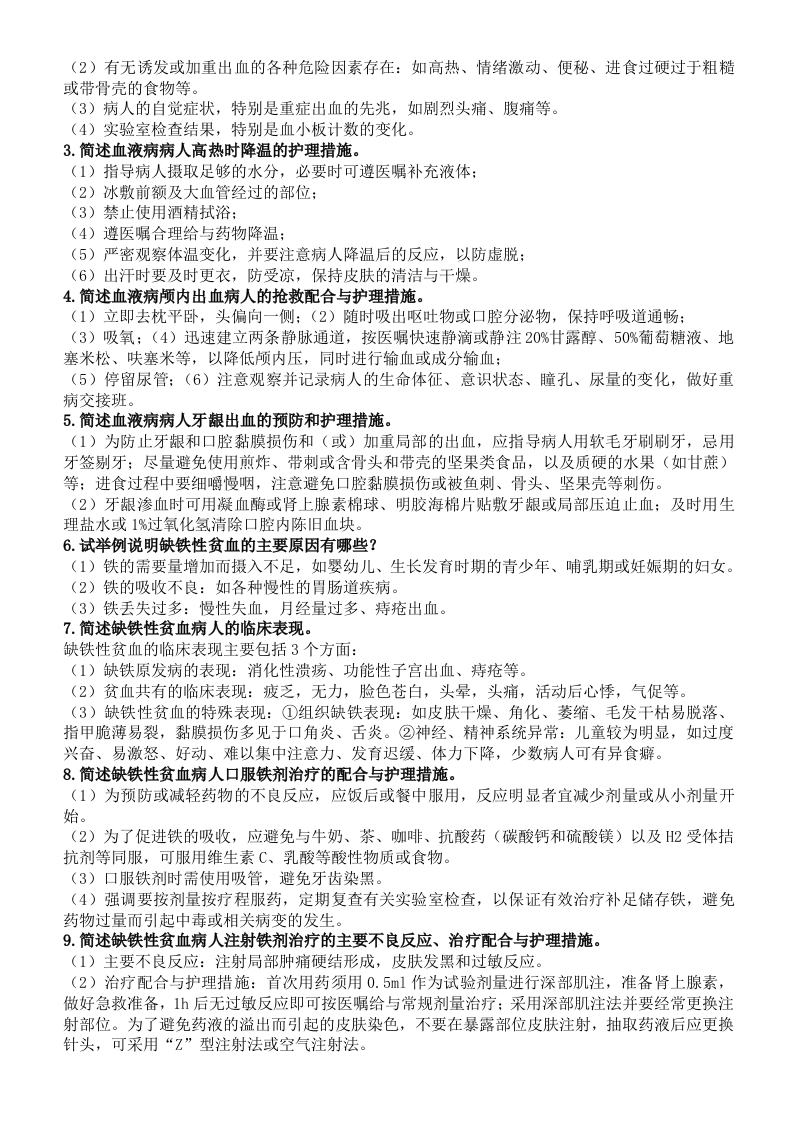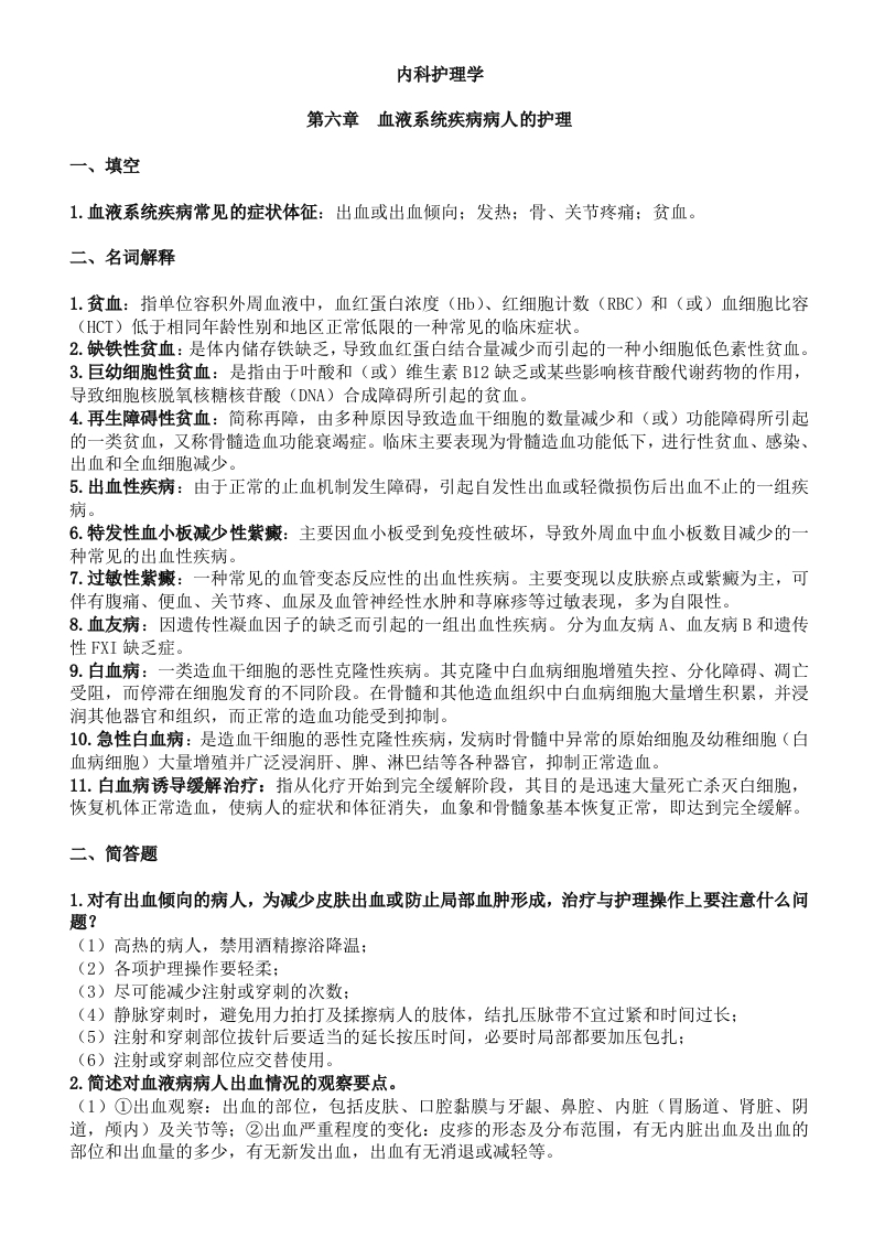 内科护理学第六章血液系统疾病病人的护理一、填空1.血液系统疾病常见的症状体征:出血或出血倾向:发热:骨、关节疼痛:贫血。二、名词解释1.贫血:指单位容积外周血液中,血红蛋白浓度(Hb)、红细胞计数(RBC)和(或)血细胞比容(HCT)低于相同年龄性别和地区正常低限的一种常见的临床症状。2.缺铁性贫血:是体内储存铁缺乏,导致血红蛋白结合量减少而引起的一种小细胞低色素性贫血。3.巨幼细胞性贫血:是指由于叶酸和(或)维生素B12缺乏或某些影响核苷酸代谢药物的作用,导致细胞核脱氧核糖核苷酸(DNA)合成障碍所引起的贫血。4.再生障碍性贫血:简称再障,由多种原因导致造血干细胞的数量减少和(或)功能障碍所引起的一类贫血,又称骨髓造血功能衰竭症。临床主要表现为骨髓造血功能低下,进行性贫血、感染、出血和全血细胞减少。5.出血性疾病:由于正常的止血机制发生障碍,引起自发性出血或轻微损伤后出血不止的一组疾病。6.特发性血小板减少性紫癜:主要因血小板受到免疫性破坏,导致外周血中血小板数目减少的一种常见的出血性疾病。7.过敏性紫癜:一种常见的血管变态反应性的出血性疾病。主要变现以皮肤瘀点或紫癜为主,可伴有腹痛、便血、关节疼、血尿及血管神经性水肿和荨麻疹等过敏表现,多为自限性8.血友病:因遗传性凝血因子的缺乏而引起的一组出血性疾病。分为血友病A、血友病B和遗传性FXI缺乏症。9.白血病:一类造血干细胞的恶性克隆性疾病。其克隆中白血病细胞增殖失控、分化障碍、凋亡受阻,而停滞在细胞发育的不同阶段。在骨髓和其他造血组织中白血病细胞大量增生积累,并浸润其他器官和组织,而正常的造血功能受到抑制。10.急性白血病:是造血干细胞的恶性克隆性疾病,发病时骨髓中异常的原始细胞及幼稚细胞(白血病细胞)大量增殖并广泛浸润肝、脾、淋巴结等各种器官,抑制正常造血。11.白血病诱导缓解治疗:指从化疗开始到完全缓解阶段,其目的是迅速大量死亡杀灭白细胞,恢复机体正常造血,使病人的症状和体征消失,血象和骨髓象基本恢复正常,即达到完全缓解。二、简答题1.对有出血倾向的病人,为减少皮肤出血或防止局部血肿形成,治疗与护理操作上要注意什么问题?(1)高热的病人,禁用酒精擦浴降温:(2)各项护理操作要轻柔:(3)尽可能减少注射或穿刺的次数:(4)静脉穿刺时,避免用力拍打及揉擦病人的肢体,结扎压脉带不宜过紧和时间过长:(5)注射和穿刺部位拔针后要适当的延长按压时间,必要时局部都要加压包扎:(6)注射或穿刺部位应交替使用。2.简述对血液病病人出血情况的观察要点。(1)①出血观察:出血的部位,包括皮肤、口腔黏膜与牙龈、鼻腔、内脏(胃肠道、肾脏、阴道,顿内)及关节等:②出血严重程度的变化:皮疹的形态及分布范围,有无内脏出血及出血的部位和出血量的多少,有无新发出血,出血有无消退或减轻等。