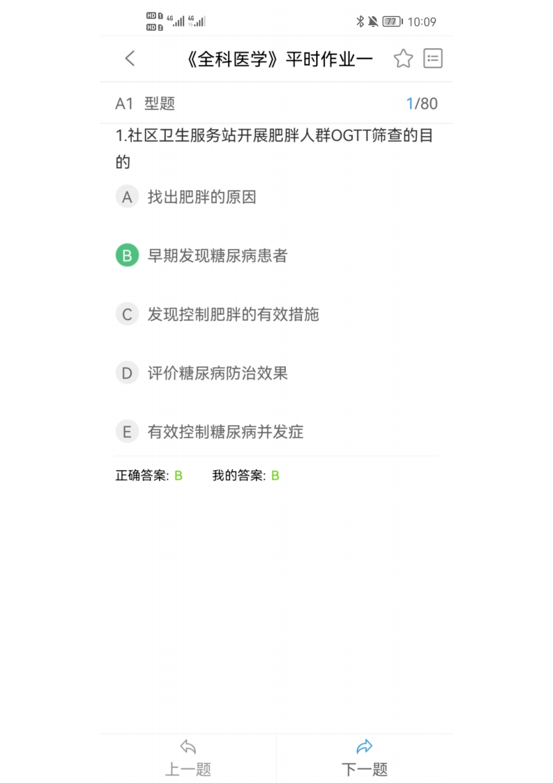 全科平时作业1qweryou25年9月18日发布关注私信21.35MB80页049010 第1页 / 共80页 第2页 / 共80页 该文档为免费文档,您可直接下载完整版进行阅读 © 版权声明文章版权归作者所有,转载请注明来源,未经允许请勿转载。本站内容均来自用户投稿或网络公开收集,本站只做展示,不对内容真实性负责。THE END医学期末考试 文本预览 D06dl6lHD R米月可110:09《全科医学》平时作业一☆曰A1型题1/801.社区卫生服务站开展肥胖人群OGTT筛查的目的A找出肥胖的原因B早期发现糖尿病患者发现控制肥胖的有效措施D评价糖尿病防治效果E有效控制糖尿病并发症正确答案:B我的答案:B分ò上一题下一题 查看更多 收起部分 喜欢就支持一下吧点赞10 分享QQ空间微博QQ好友海报分享复制链接收藏
