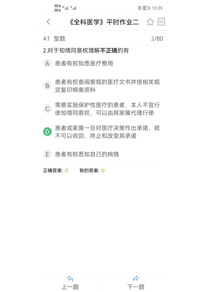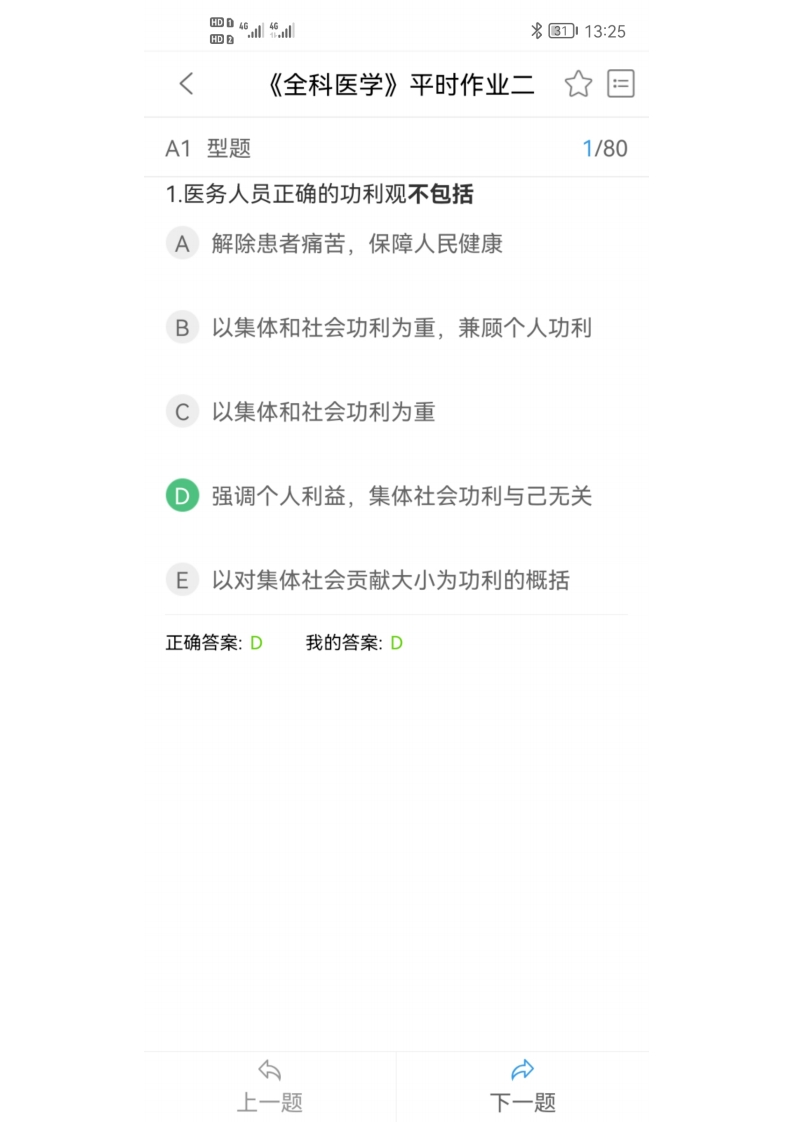 全科平时作业2qweryou25年9月18日发布关注私信18.21MB80页012312 第1页 / 共80页 第2页 / 共80页 该文档为免费文档,您可直接下载完整版进行阅读 © 版权声明文章版权归作者所有,转载请注明来源,未经允许请勿转载。本站内容均来自用户投稿或网络公开收集,本站只做展示,不对内容真实性负责。THE END医学期末考试 文本预览 四06delHD R米3①113:25《全科医学》平时作业二☆曰A1型题1/801.医务人员正确的功利观不包括A解除患者痛苦,保障人民健康B以集体和社会功利为重,兼顾个人功利以集体和社会功利为重强调个人利益,集体社会功利与己无关E以对集体社会贡献大小为功利的概括正确答案:D我的答案:D分ò上一题下一题 查看更多 收起部分 喜欢就支持一下吧点赞12 分享QQ空间微博QQ好友海报分享复制链接收藏