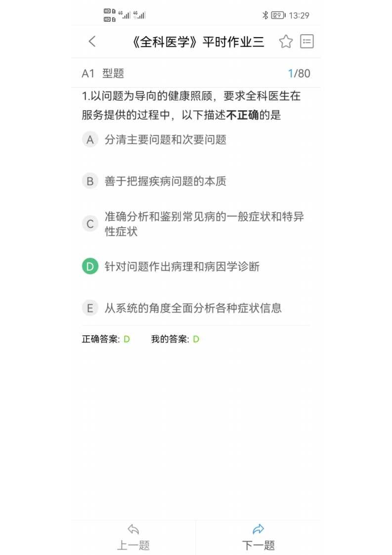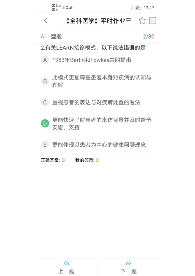 四06dlHD R米29113:29《全科医学》平时作业三☆目A1型题2/802.有关LEARN:接诊模式,以下说法错误的是A1983年Berlin和Fowkes共同提出此模式更加尊重患者本身对疾病的认知与B理解C重视患者的表达与对疾病处置的看法更能快速了解患者的来访背景并及时给予安慰、支持E更能体现以患者为中心的健康照顾理念正确答案:D我的答案:Dò上一题下一题