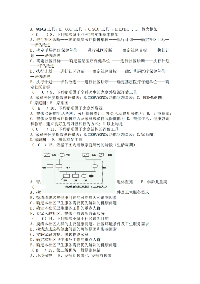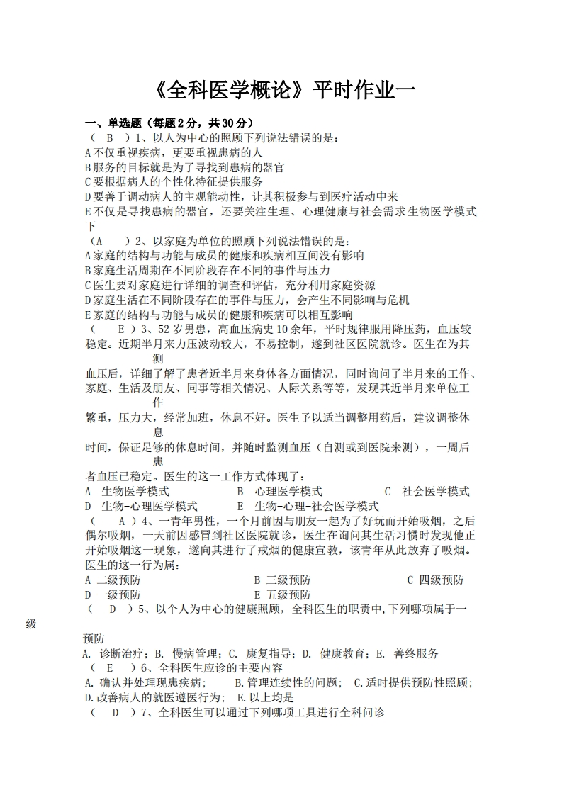 《全科医学概论》平时作业一一、单选题(每题2分,共30分)(B)1、以人为中心的照顾下列说法错误的是:A不仅重视疾病,更要重视患病的人B服务的目标就是为了寻找到患病的器官C要根据病人的个性化特征提供服务D要善于调动病人的主观能动性,让其积极参与到医疗活动中来E不仅是寻找患病的器官,还要关注生理、心理健康与社会需求生物医学模式下(A)2、以家庭为单位的照顾下列说法错误的是:A家庭的结构与功能与成员的健康和疾病相互间没有影响B家庭生活周期在不同阶段存在不同的事件与压力C医生要对家庭进行详细的调查和评估,充分利用家庭资源D家庭生活在不同阶段存在的事件与压力,会产生不同影响与危机E家庭的结构与功能与成员的健康和疾病可以相互影响(E)3、52岁男患,高血压病史10余年,平时规律服用降压药,血压较稳定。近期半月来力压波动较大,不易控制,遂到社区医院就诊。医生在为其测血压后,详细了解了患者近半月来身体各方面情况,同时询问了半月来的工作、家庭、生活及朋友、同事等相关情况、人际关系等等,发现其近半月来单位工作繁重,压力大,经常加班,休息不好。医生予以适当调整用药后,建议调整休息时间,保证足够的休息时间,并随时监测血压(自测或到医院来测),一周后患者血压已稳定。医生的这一工作方式体现了:A生物医学模式B心理医学模式C社会医学模式D生物-心理医学模式E生物-心理-社会医学模式(A)4、一青年男性,一个月前因与朋友一起为了好玩而开始吸烟,之后偶尔吸烟,一天前因感冒到社区医院就诊,医生在询问其生活习惯时发现他正开始吸烟这一现象,遂向其进行了戒烟的健康宣教,该青年从此放弃了吸烟。医生的这一行为属:A二级预防B三级预防C四级预防D一级预防E五级预防(D)5、以个人为中心的健康照顾,全科医生的职责中,下列哪项属于一级预防A.诊断治疗;B.慢病管理:C.康复指导;D.健康教育;E.善终服务(E)6、全科医生应诊的主要内容A.确认并处理现患疾病:B.管理连续性的问题:C适时提供预防性照顾:D.改善病人的就医遵医行为:E.以上均是(D)7、全科医生可以通过下列哪项工具进行全科问诊