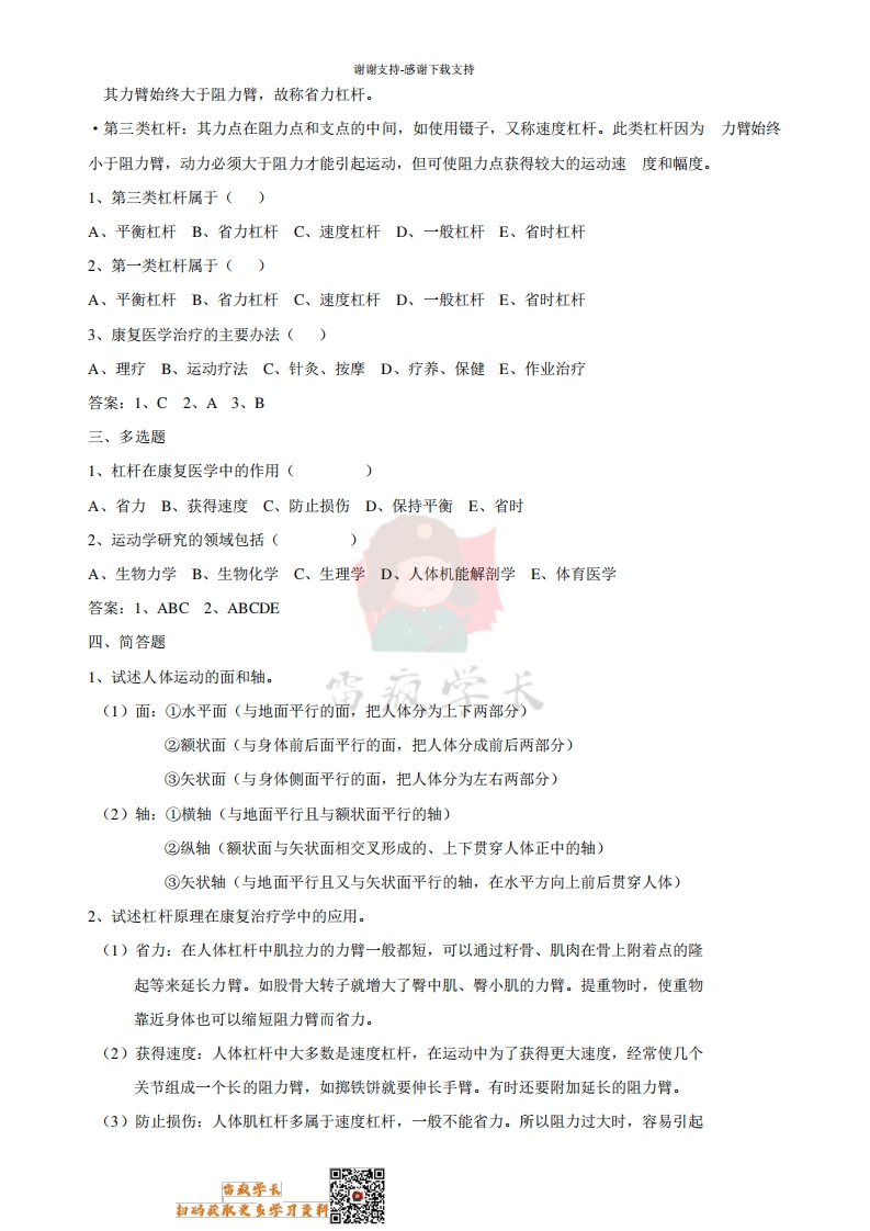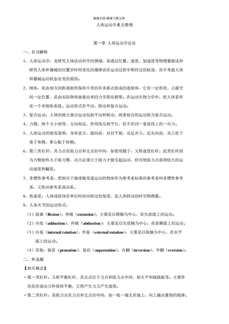 谢谢支持-感谢下载支持人体运动学重点整理第一章人体运动学总论一、名词解释1、人体运动学:是研究人体活动科学的领域,是通过位置、速度、加速度等物理量描述和研究人体和器械的位置岁时间变化的规律活在运动过程中所经过的轨迹,而不考虑人体和器械运动状态改变的原因。2、刚体:是由相互间距离始终保持不变的许多质点组成的连续体,它有一定形状、占据空间一定位置,是由实际物体抽象出来的力学简化模型。在运动生物力学中,把人体看作是一个多刚体系统。运动形式有平动、转动和复合运动。3、复合运动:人体的绝大部分运动包括平动和转动,两者结合的运动称为复合运动。4、力偶:两个大小相等、方向相反、作用线互相平行,但不在同一条直线上的一对力。5、人体运动的始发姿势:身体直立,面向前,双目平视,双足并立,足尖向前,双上肢下垂于体侧,掌心贴于体侧。6、第三类杠杆:其力点在阻力点和支点的中间,如使用镊子,又称速度杠杆。此类杠杆因为力臂始终小于阻力臂,动力必须大于阻力才能引起运动,但可使阻力点获得较大的运动速度和幅度。7、非惯性参考系:把相对于地球做变速运动的物体作为参考系标准的参考系叫非惯性参考系,又称动参考系或动系。8、角速度:人体或肢体在单位时间内转过的角度,是人体转动的时空物理量。9、人体关节的运动形式:(1)屈曲(flexion)、伸展(extension):主要是以横轴为中心,在矢状面上的运动。(2)内收(adduction、外展(abduction):主要是以矢状轴为中心,在前额面上的运动。(3)内旋(internal rotation)、外旋(external rotation):主要是以纵轴为中心,在水平面上的运动。(4)其他:旋前(pronation)、旋后(supernation)、内翻(inversion)、外翻(eversion).二、单选题【相关概念】·第一类杠杆:又称平衡杠杆,其支点位于力点和阻力点中间,如天平和跷跷板等。主要作用是传递动力和保持平衡,它即产生力又产生速度。·第二类杠杆:其阻力点在力点和支点的中间,如一根一端支在地上,向上撬动重物的棍棒。