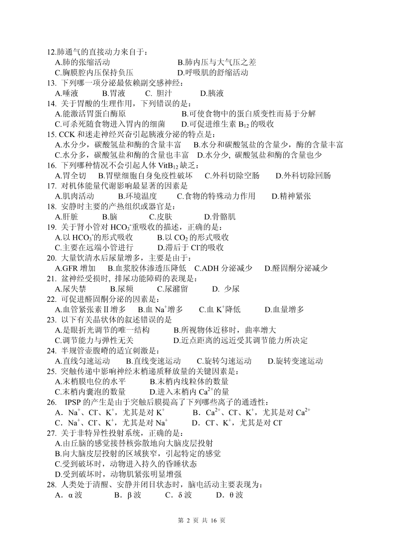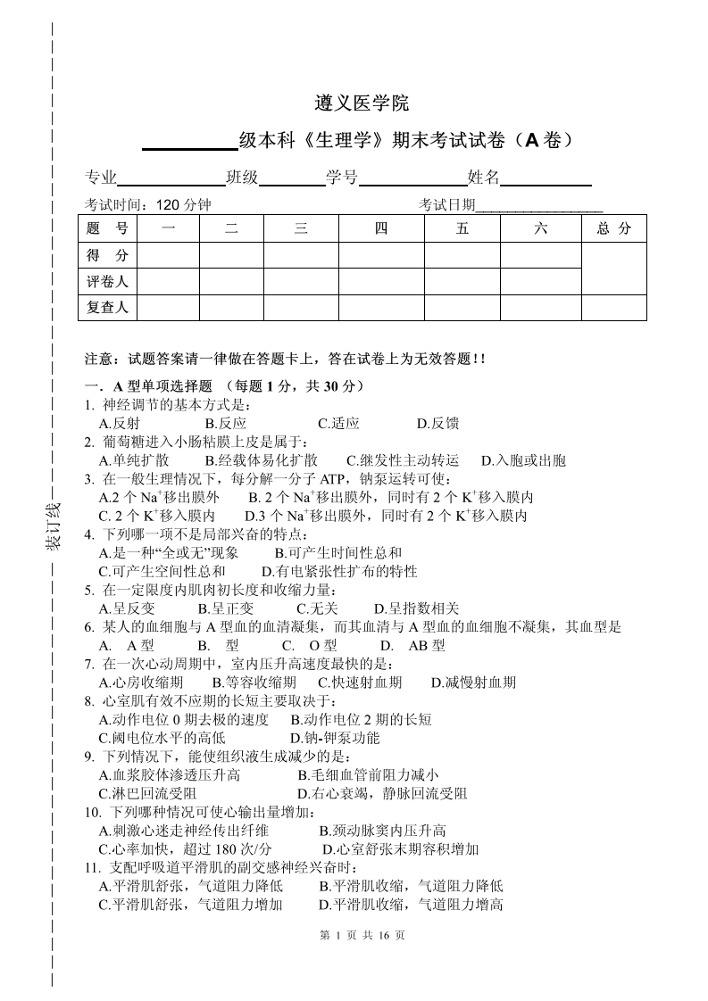 遵义医学院级本科《生理学》期末考试试卷(A卷)专业班级学号姓名考试时间:120分钟考试日期题号二三四五六总分得分评卷人复查人注意:试题答案请一律做在答题卡上,答在试卷上为无效答题!!一.A型单项选择题(每题1分,共30分)1.神经调节的基本方式是:A.反射B.反应C.适应D.反馈2.葡萄糖进入小肠粘膜上皮是属于:A.单纯扩散B.经载体易化扩散C.继发性主动转运D,入胞或出胞3.在一般生理情况下,每分解一分子ATP,钠泵运转可使:A.2个Na移出膜外B.2个Na移出膜外,同时有2个K移入膜内C.2个K移入膜内D.3个Na移出膜外,同时有2个K移入膜内怒4.下列哪一项不是局部兴奋的特点:A.是一种“全或无”现象B.可产生时间性总和C.可产生空间性总和D.有电紧张性扩布的特性5.在一定限度内肌肉初长度和收缩力量:A.呈反变B.呈正变C.无关D.呈指数相关6.某人的血细胞与A型血的血清凝集,而其血清与A型血的血细胞不凝集,其血型是A.A型B.型C.O型D.AB型7.在一次心动周期中,室内压升高速度最快的是:A.心房收缩期B.等容收缩期C.快速射血期D.减慢射血期8.心室肌有效不应期的长短主要取决于:A动作电位0期去极的速度B.动作电位2期的长短C.阈电位水平的高低D.钠-钾泵功能9.下列情况下,能使组织液生成减少的是:A血浆胶体渗透压升高B.毛细血管前阻力减小C.淋巴回流受阻D,右心衰竭,静脉回流受阻10.下列哪种情况可使心输出量增加:A刺激心迷走神经传出纤维B颈动脉窦内压升高C.心率加快,超过180次/分D,心室舒张末期容积增加11.支配呼吸道平滑肌的副交感神经兴奋时:A平滑肌舒张,气道阻力降低B.平滑肌收缩,气道阻力降低C.平滑肌舒张,气道阻力增加D.平滑肌收缩,气道阻力增高第1页共16页