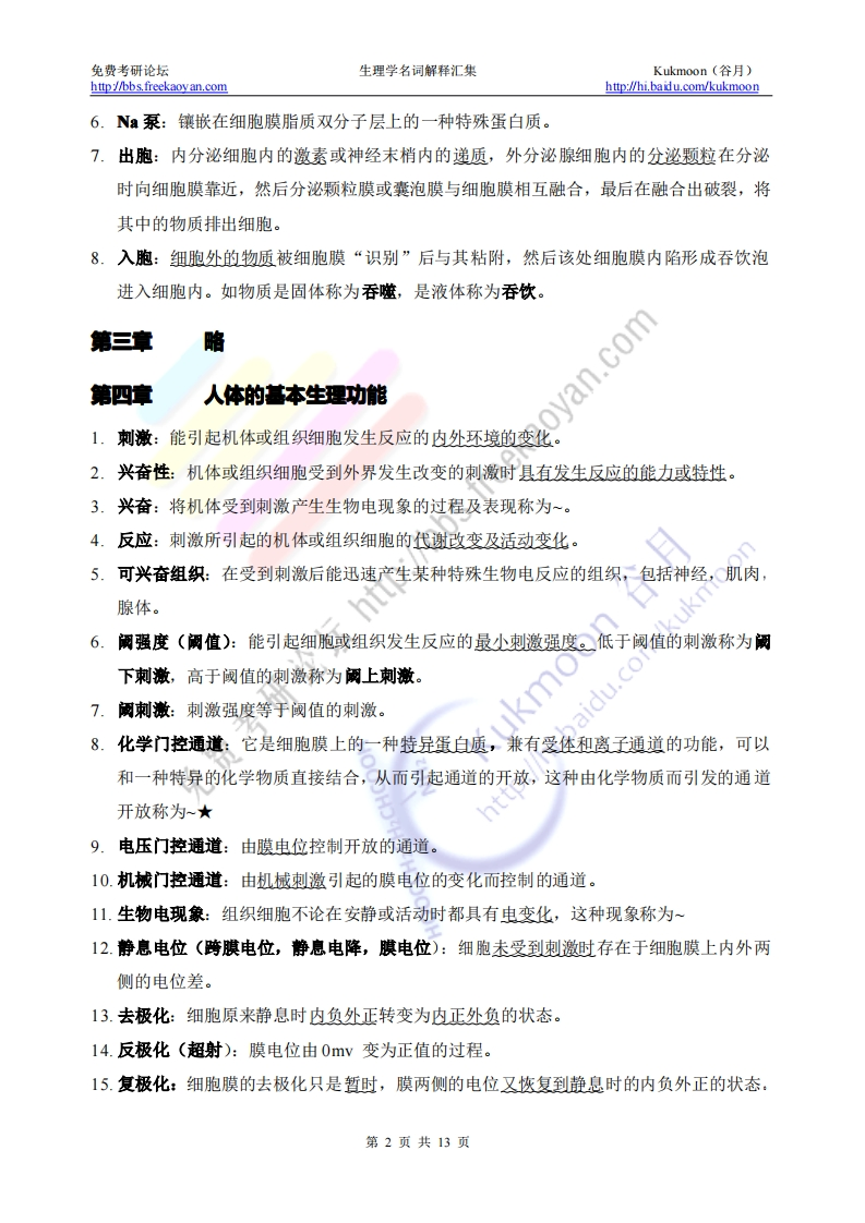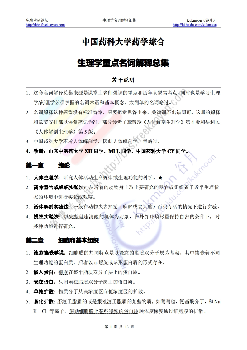 免费考研论坛生理学名词解释汇集Kukmoon(谷月)http //bbs.freekaoyan.comhttp://hi.baidu.com/kukmoon中国药科大学药学综合生理学重点名词解释总集若千说明1.这套名词解释总集来源是课堂上老师强调的重点和历年真题常考点,同时也是学习生理学药理学必须掌握的名词术语和基本概念。太简单的名词略过。○2.名词解释这种题型没有标准答案,只要把意思答出来,关键词不出错即可。这里的解释和章节安排都以课堂笔记为准,部分参考了龚茜玲《人体解剖生理学》第4版和岳利民《人体解剖生理学》第5版。3.中国药科大学不考人体解剖学,因此人体解剖学一章略过。4,致谢:山东中医药大学XH同学、LL同学,中国药科大学CY同学。第一章绪论1.人体生理学:研究人体活动生命规律或生理功能的科学。kukmoon2.高体器官或组织实验法:从活着的动物身上取出要研究的器官或组织置于近乎生理状态的环境中进行实验或观察。A3.活体解剖实验法:仁般在动物失去知觉(麻醉或去大脑)而仍存活的情况下进行实验。4.慢性实验法:以完整健康清醒的机体为对象,在外界环境尽量保持自然的条件下,对某种功能进行研究。第二章细胞和基本组织1.液态镶嵌学说:细胞膜的共同特点是以液态的脂质双分子层为基架,其中镶嵌着不同生理功能的蛋白质,后者以a-螺旋或球形蛋白质的形式存在。2.嵌入蛋白:镶嵌在整个脂质双分子层上的蛋白质。3.表在蛋白:只附着在脂质双分子层上的蛋白质。4.单纯扩散:物质分子从高浓度区向低浓度区的扩散。5.易化扩散:不溶于脂质的或是很难溶于脂质的某些物质,如葡萄糖,氨基酸分子,和NKC1等离子,借助细胞膜上某些特殊的蛋白质顺浓度梯度通过细胞膜的扩散。第1页共13页