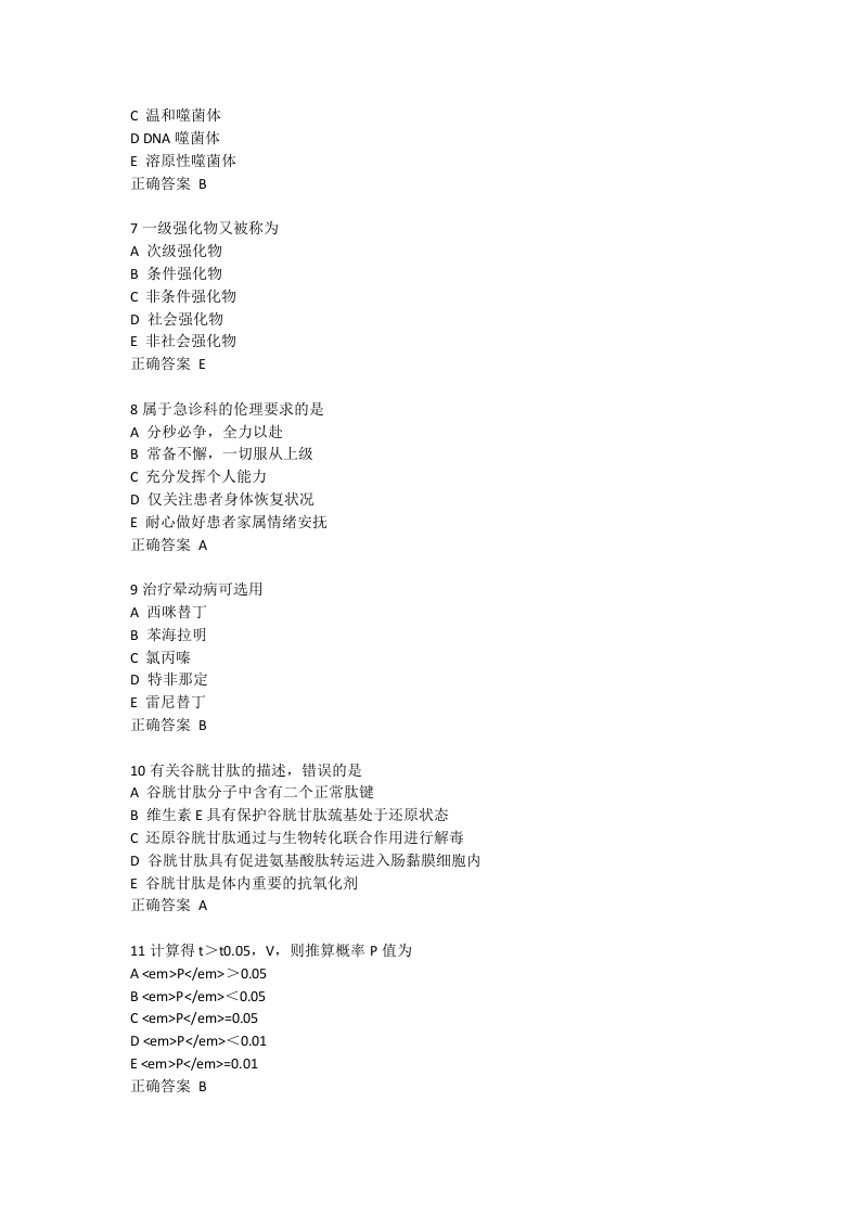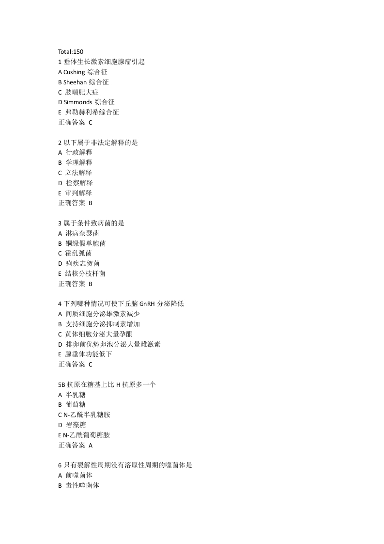 Total:1501垂体生长激素细胞腺瘤引起A Cushing综合征B Sheehan综合征C肢端肥大症D Simmonds综合征E弗勒赫利希综合征正确答案C2以下属于非法定解释的是A行政解释B学理解释C立法解释D检察解释E审判解释正确答案B3属于条件致病菌的是A淋病奈瑟菌B铜绿假单胞菌C霍乱弧菌D痢疾志贺菌E结核分枝杆菌正确答案B4下列哪种情况可使下丘脑GRH分泌降低A间质细胞分泌雄激素减少B支持细跑分泌抑制素增加C黄体细胞分泌大量孕酮D排卵前优势卵泡分泌大量雌激素E腺垂体功能低下正确答案C5B抗原在糖基上比H抗原多一个A半乳糖B葡萄糖CN-乙酰半乳糖胺D岩藻糖EN-乙酰葡萄糖胺正确答案A6只有裂解性周期没有溶原性周期的噬菌体是A前噬菌体B毒性噬菌体