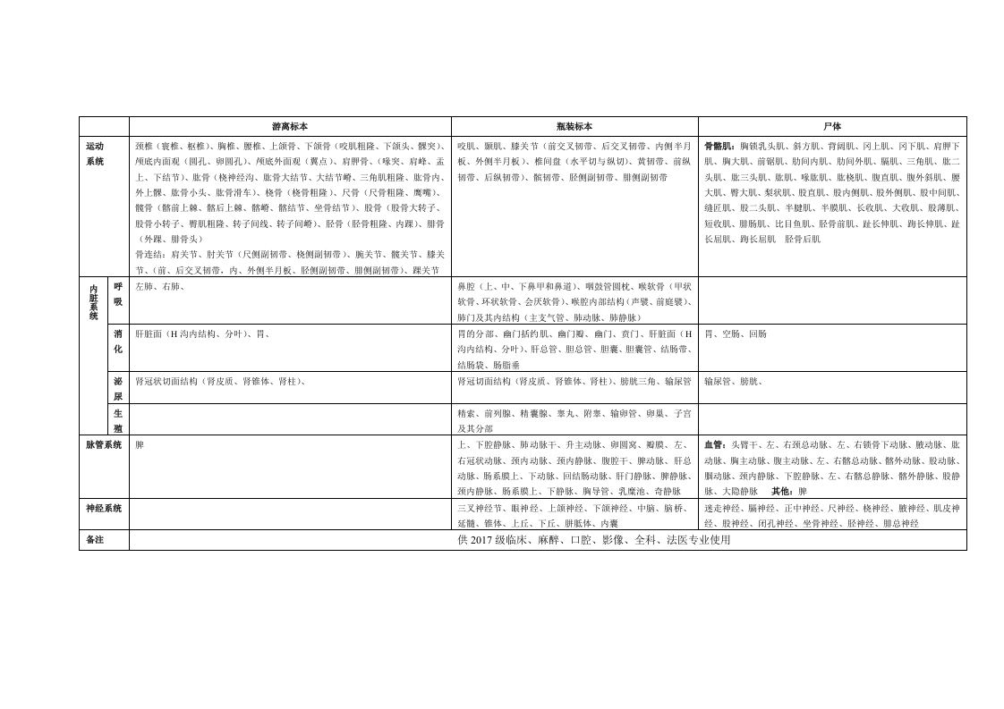 游离标本瓶装标本尸体运动颈椎(寰椎、枢椎)、胸椎、腰椎、上颌骨、下颌骨(咬肌粗隆、下颌头、限突)、咬肌、顺肌、膝关节(前交叉韧带、后交叉韧带、内侧半月骨酪肌:胸锁乳头肌、斜方肌、肾阔肌、冈上肌、冈下肌、肩胛下系统颅底内面观(圆孔、卵圆孔)、颅底外面观(翼点)、肩胛骨、(喙突、肩蜂、孟板、外侧半月板)、椎间盘(水平切与纵切)、黄韧带、前纵肌、胸大肌、前据肌、肋间内肌、肋间外肌、膈肌、三角肌、账二上、下结节)、账骨(桡神经沟、账骨大结节、大结节峰、三角肌粗隆、肱骨内、韧带、后纵韧带)、髌韧带、胫侧副韧带、腓侧副韧带头肌、账三头肌、肱肌、喙账肌、肱桡肌、腹直肌、腹外斜肌、腰外上限、贴骨小头、贴骨滑车)、桡骨(桡骨粗隆)、尺骨(尺骨粗隆、鹰嘴)、大肌、臀大肌、梨状肌、股直肌、股内侧肌、股外侧肌、股中间肌、脆骨(髂前上棘、酪后上棘、酪蜡、髂结节、坐骨结节)、股骨(股骨大转子、缝匠肌、股二头肌、半腱肌、半膜肌、长收肌、大收肌、股薄肌、股骨小转子、臀肌粗隆、转子间线、转子间嵴)、胫骨(胫骨粗隆、内踝)、腓骨短收肌、腓肠肌、比日鱼肌、胫骨前肌、胜长伸肌、膨长伸肌、趾(外踝、册骨头)长居肌、陟长屈肌胫骨后肌骨连结:肩关节、肘关节〔尺侧刷韧带、桡侧剧韧带)、胞关节、脆关节、脖关节、(前、后交叉韧带,内、外侧半月板、胫侧剧韧带、腓侧刷韧带、踝关节左肺、右肺、鼻腔(上、中、下鼻甲和鼻道)、咽效管圆枕、喉软骨(甲祝吸软骨、环状软骨、会厌软骨)、喉腔内部结构(声襞、前庭袋)、肺门及其内结构(主支气管、肺动脉、肺静脉)消肝脏面(H沟内结构、分叶)、胃、胃的分部、幽门括韵肌、幽门彩、幽门、资门、肝脏面(H胃、空肠、回肠化沟内结构、分叶)、肝总管、胆总管、胆囊、胆囊管、结肠带、结肠袋、肠脂垂肾冠状切面结构(肾皮质、肾锥体、肾柱)、肾冠切面结构(肾皮质、肾锥体、肾柱)、膀胱三角、输尿管输尿管、膀胱、尿生精索、前列腺、精囊腺、整丸、附塞、输卵管、卵巢、子宫殖及其分部脉管系统上、下腔静脉、肺动脉干、升主动脉、卵圆窝、瓣膜、左、血管:头臂干、左、右颈总动脉、左、右锁骨下动脉、肢动脉、账右冠状动脉、颈内动脉、颈内静脉、腹腔干、脾动脉、肝总动脉、胸主动脉、腹主动脉、左、右髂总动脉、髂外动脉、股动脉、动脉、肠系膜上、下动脉、回结肠动脉、肝门静脉、脾静脉。用动脉、颈内静脉、下腔静脉、左、右髂总静脉、髂外静脉、股静颈内静脉、肠系膜上、下静脉、胸导管、乳廉池、奇静脉脉、大隐静脉其他:脾神经系统三叉神经节、眼神经、上颌神经、下领神经、中脑、脑桥、迷走神经、膈神经、正中神经、尺神经、桡神经、肢神经、肌皮神延髓、雏体、上丘、下丘、肼胝体、内囊经、股神经、闭孔神经、坐骨神经、胫神经、腓总神经备注供2017级临床、麻醉、口腔、影像、全科、法医专业使用