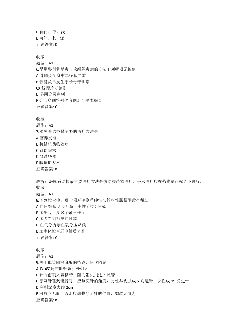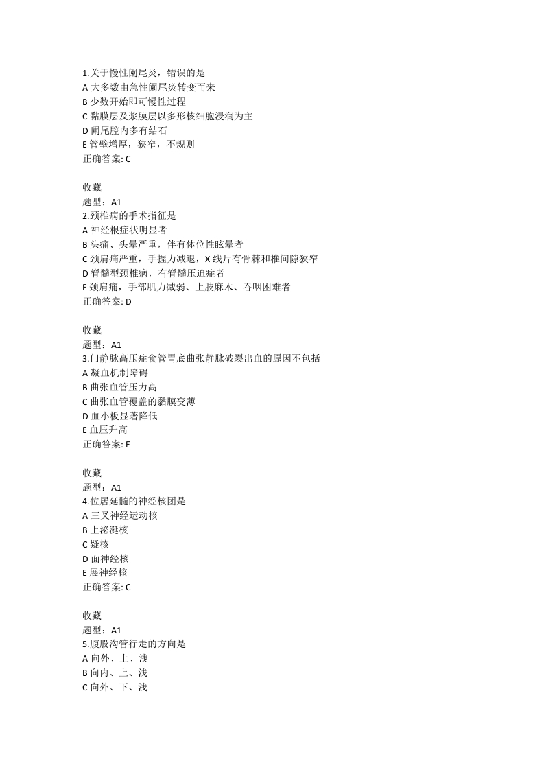 1.关于慢性阑尾炎,错误的是A大多数由急性阑尾炎转变而来B少数开始即可慢性过程C黏膜层及浆膜层以多形核细胞浸润为主D阑尾腔内多有结石E管壁增厚,狭窄,不规则正确答案:C收藏题型:A12.颈推病的手术指征是A神经根症状明显者B头痛、头晕严重,伴有体位性眩晕者C颈肩痛严重,手握力减退,X线片有骨棘和椎间隙狭窄D脊髓型颈椎病,有脊髓压迫症者E颈肩痛,手部肌力减弱、上肢麻木、吞咽困难者正确答案:D收藏题型:A13.门静脉高压症食管胃底曲张静脉破裂出血的原因不包括A凝血机制障碍B曲张血管压力高C曲张血管覆盖的黏膜变薄D血小板显著降低E血压升高正确答案:E收藏题型:A14.位居延髓的神经核团是A三叉神经运动核B上泌涎核C疑核D面神经核E展神经核正确答案:C收藏题型:A15.腹股沟管行走的方向是A向外、上、浅B向内、上、浅C向外、下、浅