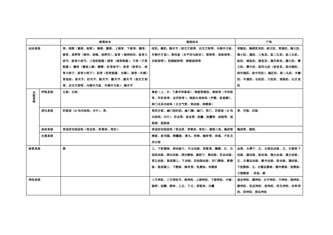 游离标本瓶装标本尸体运动系统骨:颈检(袁椎、枢椎)、胸椎、腰椎、上颌骨、下颌骨、癫骨、咬肌、额肌、膝关节(前交叉韧带、后交叉韧带、内侧半月板、骨略肌:胸锁乳突肌、斜方肌、背偏肌、胸大肌、锁骨、肩胛骨(嚎突、肩峰、肩胛冈)、肚骨(桡神经沟、败滑大外侧半月板)、椎间盘(水平切与纵切)、黄韧带、前纵韧带、胸小肌、隔肌、三角肌、肚二头肌、肱三头肌、结节、肱骨小结节、三角肌粗隆)桡骨(桡骨粗隆)入、尺骨(尺骨后纵韧带)入、胫侧副韧带、腓侧副韧带肱肌、喙肚肌、腹直肌、腹外斜肌、腰大肌、臀粗隆)入、髋骨(醉前上棘、醉嵴、坐骨结节)、股骨(股骨头、股大肌、臀中肌、股四头肌(股直肌、股内侧肌、骨大转子、股骨小转子入、胫骨(胫骨粗隆、内限)、腓骨(外深)股外侧肌、股中间肌)入、缝匠肌、股二头肌、半健骨连结:肩关节、时关节、腕关节、髋关节、膝关节(前交叉韧肌、半膜肌、长收肌、大收肌、腓肠肌、比目鱼带、后交叉韧带、内侧半月板、外侧半月板)、深关节肌内胜系统呼吸系统左肺、右肺、鼻腔(上、中、下鼻甲和鼻道)、咽蚊管圆枕、喉软骨(甲状软骨、环状软骨、会厌软骨)、喉腔内部结构(声襞、前庭襞)、肺门及其内结构(主支气管、肺动脉、肺静脉)消化系统肝脏面(H沟内结构、分叶)、胃、胃的分部、幽门括钓肌、幽门瓣、幽门、责门、肝脏面(H沟胃、空肠、回肠内结构、分叶)、肝总管、胆总管、胆囊、胆囊管、结肠带、结肠袋、肠脂垂泌尿系统肾冠状切面结构(肾皮质、肾锥体、肾柱)、肾冠状切面结构(肾皮质、肾锥体、肾柱)、蹄胱三角、输尿管输尿管、膀胱、生殖系统精紫、前列腺、精囊腺、睾丸、附裹、输卵管、卵巢、子宫及其分部脉管系统上、下腔静脉、肺动脉干、升主动脉、卵圆窝、瓣膜、左、右血管:头臂干、左、右颈总动脉、左、右锁骨下冠状动脉、颈内动脉、颈内静脉、腹腔干、胂动脉、肝总动脉、动脉、腋动脉、肚动脉、胸主动脉、腹主动脉、胃左动脉、肠系膜上、下动脉、回结肠动脉、肝门静脉、脾静左、右醉总动脉、醉外动脉、股动脉、丽动脉、脉、肠系膜上、下静脉、胸导管、乳廉池、奇静脉下腔静脉、左、右酵总静脉、酵外静脉、股静脉、大隐静脉其他:脾神经系统三叉神经、三叉神经节、眼神经、上颌神经、下颌神经、中脑、迷走神经、丽神经、正中神经、尺神经、桡神经、脑桥、延随、锥体、上丘、下丘、肼胝体、内囊腋神经、肌皮神经、股神经、闭孔神经、坐骨神经、胫神经、腓总神经