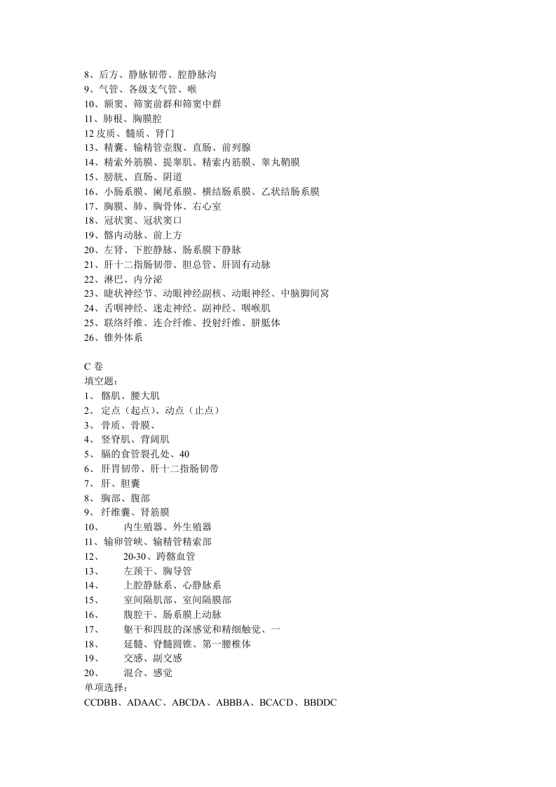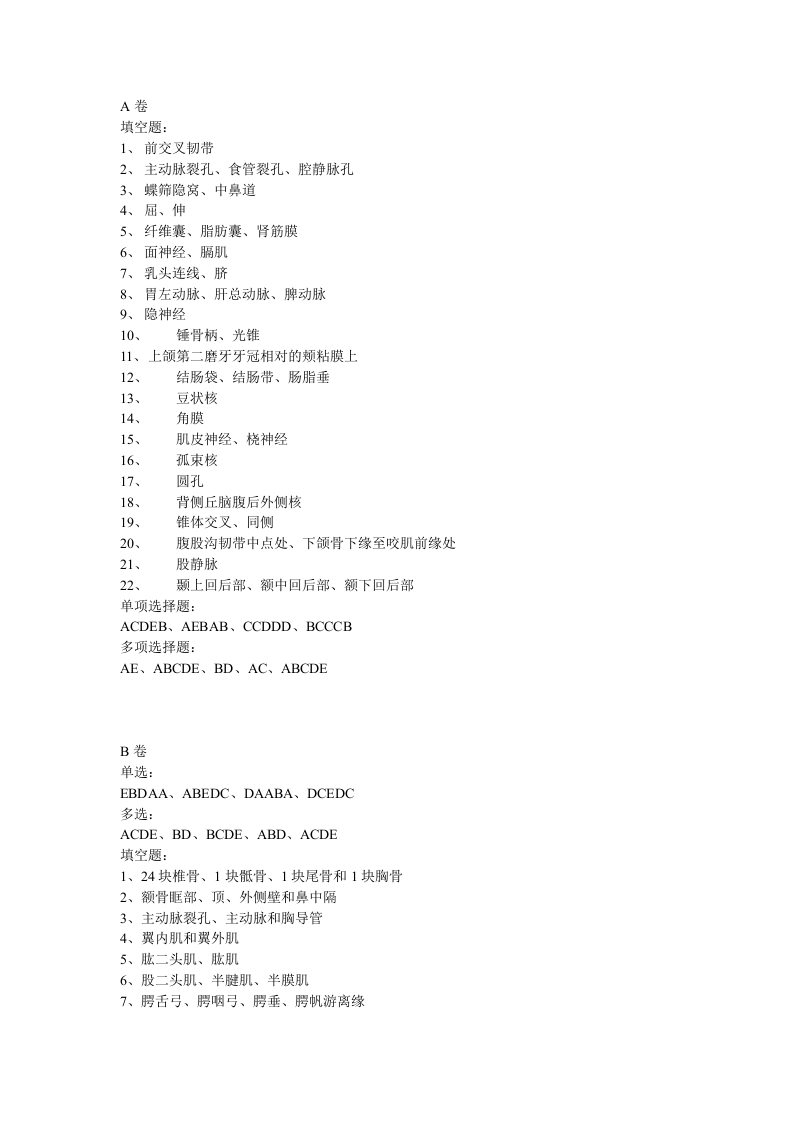 A卷填空题:1、前交叉韧带2、主动脉裂孔、食管裂孔、腔静脉孔3、蝶筛隐窝、中鼻道4、屈、伸5、纤维囊、脂肪囊、肾筋膜6、面神经、膈肌7、乳头连线、脐8、胃左动脉、肝总动脉、脾动脉9、隐神经10、锤骨柄、光锥11、上颌第二磨牙牙冠相对的颊粘膜上12、结肠袋、结肠带、肠脂垂13、豆状核14、角膜15、肌皮神经、桡神经16、孤束核17、圆孔18、背侧丘脑腹后外侧核19、锥体交叉、同侧20、腹股沟韧带中点处、下颌骨下缘至咬肌前缘处21、股静脉22、颞上回后部、额中回后部、额下回后部单项选择题:ACDEB、AEBAB、CCDDD、BCCCB多项选择题:AE、ABCDE、BD、AC、ABCDEB卷单选:EBDAA、ABEDC、DAABA、DCEDO多选:ACDE、BD、BCDE、ABD、ACDE填空题:1、24块椎骨、1块骶骨、1块尾骨和1块胸骨2、额骨眶部、顶、外侧壁和鼻中隔3、主动脉裂孔、主动脉和胸导管4、翼内肌和翼外肌5、肱二头肌、肱肌6、股二头肌、半避肌、半膜肌7、聘舌弓、腭咽弓、腭垂、腭帆游离缘