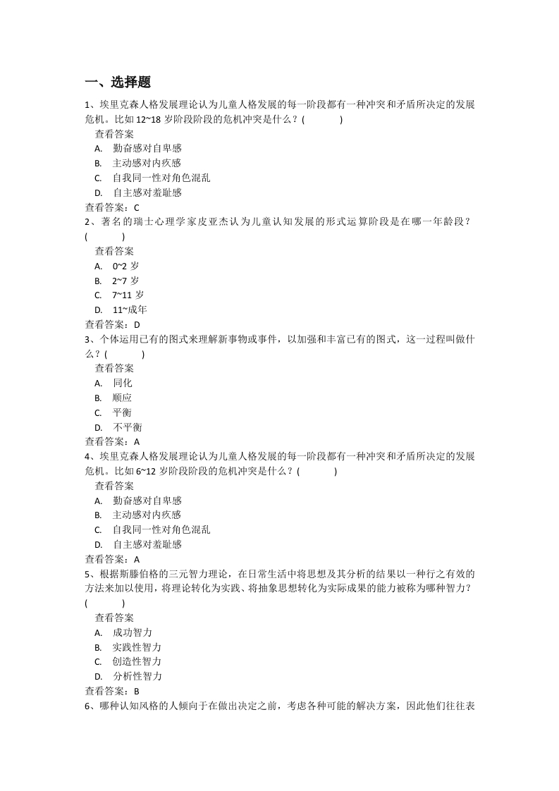 一、选择题1、埃里克森人格发展理论认为儿童人格发展的每一阶段都有一种冲突和矛盾所决定的发展危机。比如1218岁阶段阶段的危机冲突是什么?(查看答案A.勤奋感对自卑感B.主动感对内疚感C.自我同一性对角色混乱D.自主感对羞耻感查看答案:C2、著名的瑞士心理学家皮亚杰认为儿童认知发展的形式运算阶段是在哪一年龄段?查看答案A.02岁B.27岁C.711岁D.11成年查看答案:D3、个体运用己有的图式来理解新事物或事件,以加强和丰富己有的图式,这一过程叫做什么?(查看答案A.同化B.顺应C.平衡D.不平衡查看答案:A4、埃里克森人格发展理论认为儿童人格发展的每一阶段都有一种冲突和矛盾所决定的发展危机。比如612岁阶段阶段的危机冲突是什么?(查看答案A.勤奋感对自卑感B.主动感对内疚感C.自我同一性对角色混乱D.自主感对羞耻感查看答案:A5、根据斯膝伯格的三元智力理论,在日常生活中将思想及其分析的结果以一种行之有效的方法来加以使用,将理论转化为实践、将抽象思想转化为实际成果的能力被称为哪种智力?()查看答案A.成功智力B.实践性智力C.创造性智力D.分析性智力查看答案:B6、哪种认知风格的人倾向于在做出决定之前,考虑各种可能的解决方案,因此他们往往表