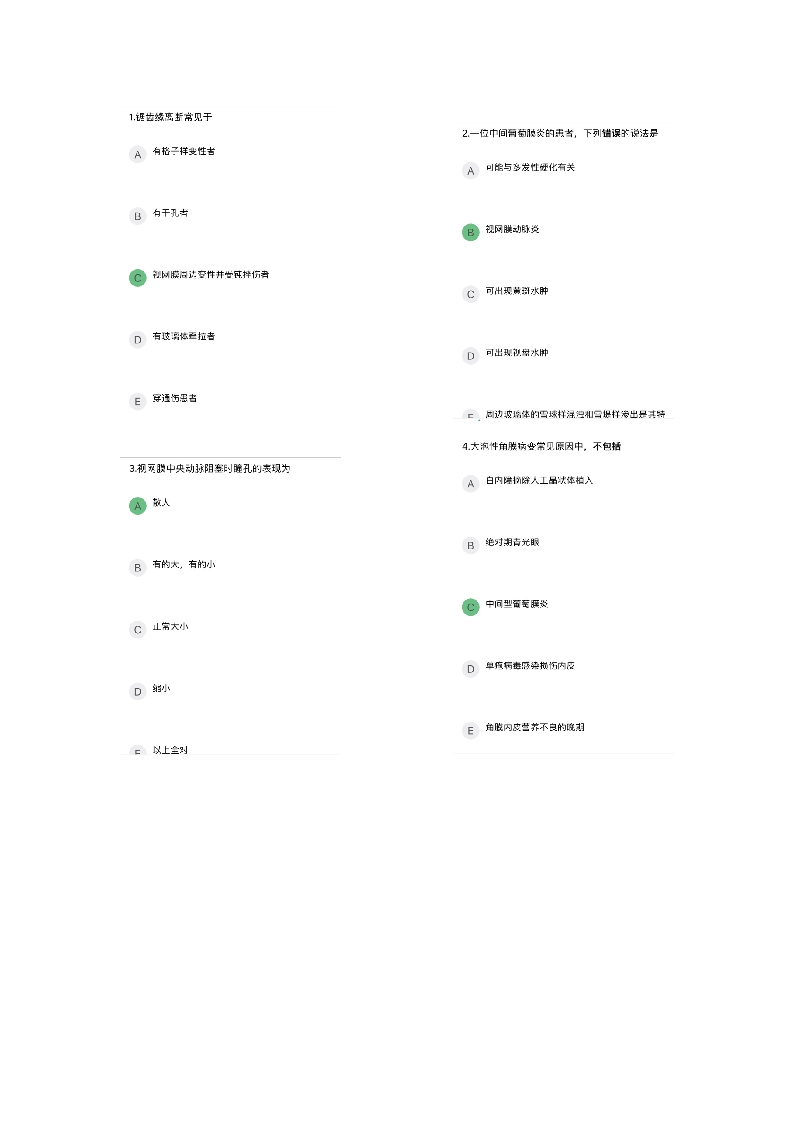 1挺齿缘鹰扩常见干2.一位巾间两萄炎的成考,下列错误式说法是A有格?样变性者A怡与多发性哑化有关B有干孔古B视网膜动脉炎C可出现尚斜水肿D有破璃临正拉者D可出现秘培水肿E年证伤思古,边玻将体的雪城样没和址样出是才特4大流件角胀病业常见原因中。不包括3视系膜中央动球阴到雎孔的表现为A白内除人工品法体入国故人B绝列闲古花眼B有的大,有的小C中间型面委展数C山常大小D单直行垫臣染批伤内区D小E角股丙皮兰芥不良的晚期E以上空别