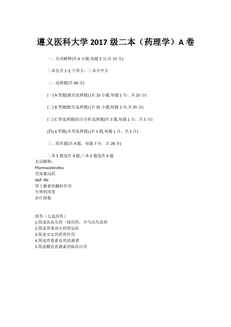 遵义医科大学2017级二本(药理学)A卷一、名词解释(共6小题,每题2分,共12分)二本包含12个英文,三本全中文二、选择题(共60分)(一)A型题(最佳选择题)(共25小题,每题1分,共25分)(二)B型题(配伍选择题)(共25小题,每题1分,共25分)(三)C型选择题(综合分析选择题)共5题,每题1分,共5分)(四)X型题(多项选择题)(共5题,每题1分,共5分)三、简答题(共4题,每题7分,共28分)二本5题选作4题:三本6题选作4题名词解释:Pharmacokinetics受体激动药Half-life肾上腺素的翻转作用生物利用度治疗指数简答(五选四答)1.简述高血压的一线用药,并写出代表药2.简述普莱洛尔的禁忌症3.简述安定的药理作用4.简述青霉素G的抗菌谱5.简述糖皮质激素的临床应用