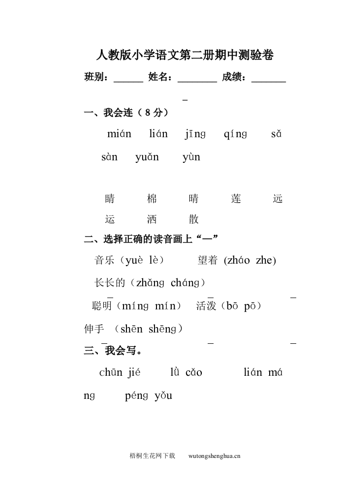 人教版小学语文第二册期中测验卷班别:姓名:成绩:一、我会连(8分)mianlianjingqingsǎsanyuanyun睛棉晴莲远运洒散二、选择正确的读音画上“一”音乐(yuelè)望着(zháozhe)长长的(zhǎng chang)聪明(ming min)活泼(bpō)伸手(shen sheng)三、我会写。chun jie1ǜcǎolian mangpeng yǒu梧桐生花网下载wutongshenghua.cn