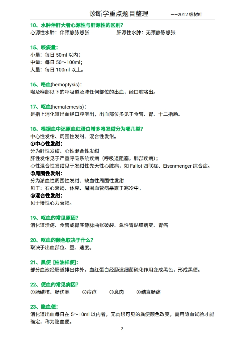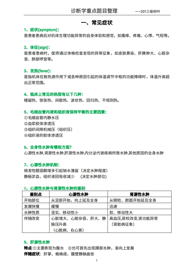诊断学重点题目整理一-2012级树叶一、常见症状1、症状(symptom):是患者患病后对机体生理功能异常的自身体验和感觉,如瘙痒、疼痛、心悸、气短等。2、体征(sign):是患者患病时,医师通过体格检查发现的异常征象,如皮肤黄染、肝脾肿大、心脏杂音、肺部啰音等。3、发热(fever):是指机体在致热源作用下或各种原因引起的体温调节中枢的功能障碍时,体温升高超出正常范围。4、临床上常见的热型有以下几种:稽留热、弛张热、间歇热、波状热、回归热、不规则热。5、毛细血管内液和组织液保持平衡的主要因素:①毛细血管内静水压②血浆胶体渗透压③组织间隙机械压(组织压)④组织液的胶体渗透压6、全身性水肿有哪些方面?心源性水肿,肾源性水肿,肝源性水肿内分泌代谢疾病所致水肿,其他原因的全身水肿7、心源性水肿机制:继发性醛固酮增多引起钠水猪留(决定水肿程度)静脉淤血,组织液回吸收减少(决定水肿部位)8、心源性水肿与肾源性水肿的鉴别鉴别点心源性水肿肾源性水肿开始部位从足部开始,向上延及全身从眼睑、颜面开始延及全身发展快慢缓慢迅速水肿性质坚实、移动性小软、移动性大伴随改变心脏增大、心脏杂音、肝大、静高血压,尿检改变,肾功能异常脉压升高(肾脏病征象)(心脏病、右心衰)9、肝源性水肿特点:①主要表现为腹水②也可首先出现踝部水肿,渐向上发展伴随症状:肝掌、蜘蛛痣、腹壁静脉曲张1