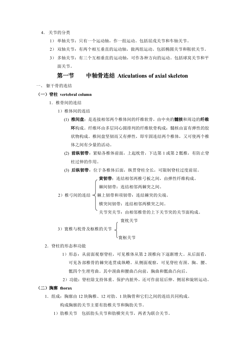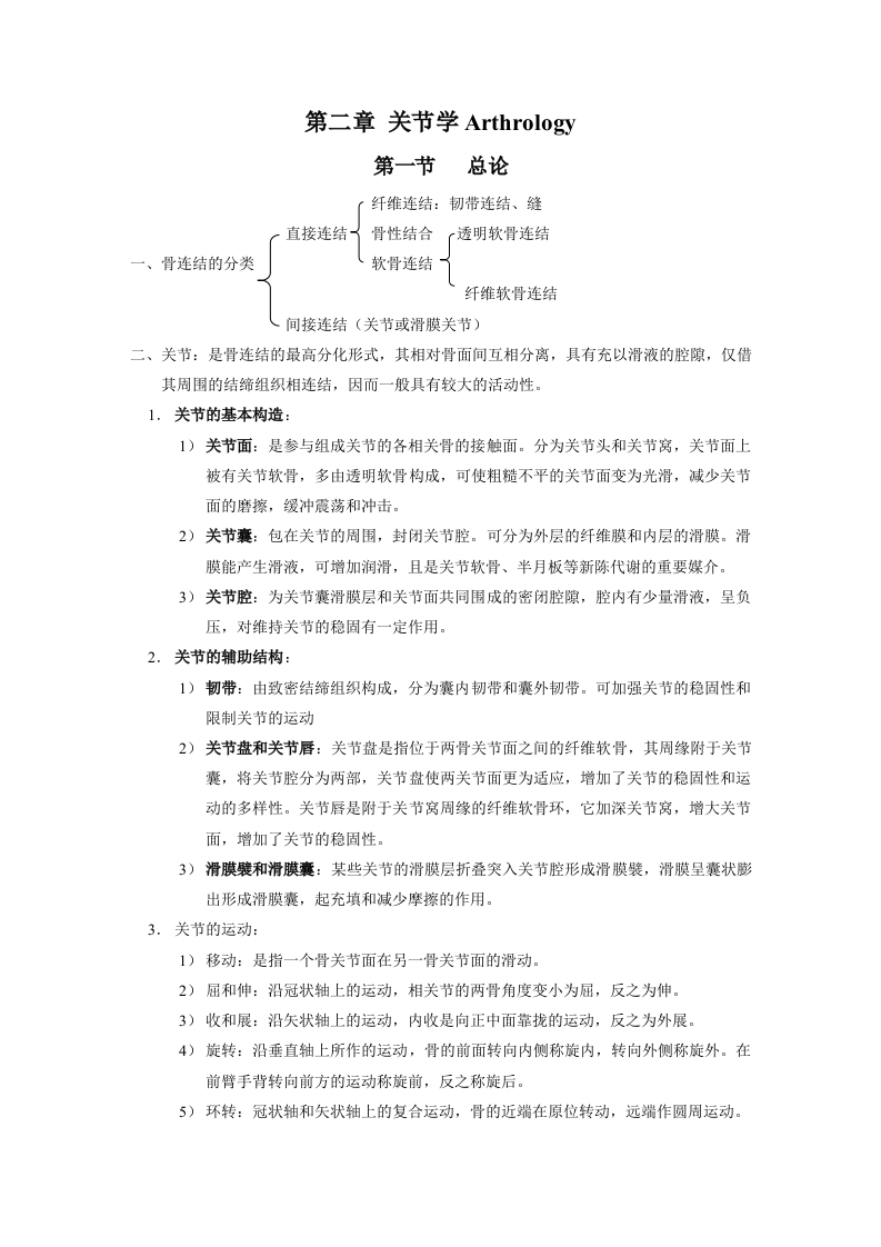 第二章关节学Arthrology第一节总论纤维连结:韧带连结、缝直接连结骨性结合,透明软骨连结一、骨连结的分类软骨连结纤维软骨连结间接连结(关节或滑膜关节)二、关节:是骨连结的最高分化形式,其相对骨面间互相分离,具有充以滑液的腔隙,仅借其周围的结缔组织相连结,因而一般具有较大的活动性。1.关节的基本构造:1)关节面:是参与组成关节的各相关骨的接触面。分为关节头和关节窝,关节面上被有关节软骨,多由透明软骨构成,可使粗糙不平的关节面变为光滑,减少关节面的磨擦,缓冲震荡和冲击。2)关节囊:包在关节的周围,封闭关节腔。可分为外层的纤维膜和内层的滑膜。滑膜能产生滑液,可增加润滑,且是关节软骨、半月板等新陈代谢的重要媒介。3)关节腔:为关节囊滑膜层和关节面共同围成的密闭腔隙,腔内有少量滑液,呈负压,对维持关节的稳固有一定作用。2.关节的辅助结构:1)韧带:由致密结缔组织构成,分为囊内韧带和囊外韧带。可加强关节的稳固性和限制关节的运动2)关节盘和关节唇:关节盘是指位于两骨关节面之间的纤维软骨,其周缘附于关节囊,将关节腔分为两部,关节盘使两关节面更为适应,增加了关节的稳固性和运动的多样性。关节唇是附于关节窝周缘的纤维软骨环,它加深关节窝,增大关节面,增加了关节的稳固性。3)滑膜襞和滑膜囊:某些关节的滑膜层折叠突入关节腔形成滑膜襞,滑膜呈囊状膨出形成滑膜囊,起充填和减少摩擦的作用。3.关节的运动:1)移动:是指一个骨关节面在另一骨关节面的滑动。2)屈和伸:沿冠状轴上的运动,相关节的两骨角度变小为屈,反之为伸。3)收和展:沿矢状轴上的运动,内收是向正中面靠拢的运动,反之为外展4)旋转:沿垂直轴上所作的运动,骨的前面转向内侧称旋内,转向外侧称旋外。在前臂手背转向前方的运动称旋前,反之称旋后。5)环转:冠状轴和矢状轴上的复合运动,骨的近端在原位转动,远端作圆周运动。
