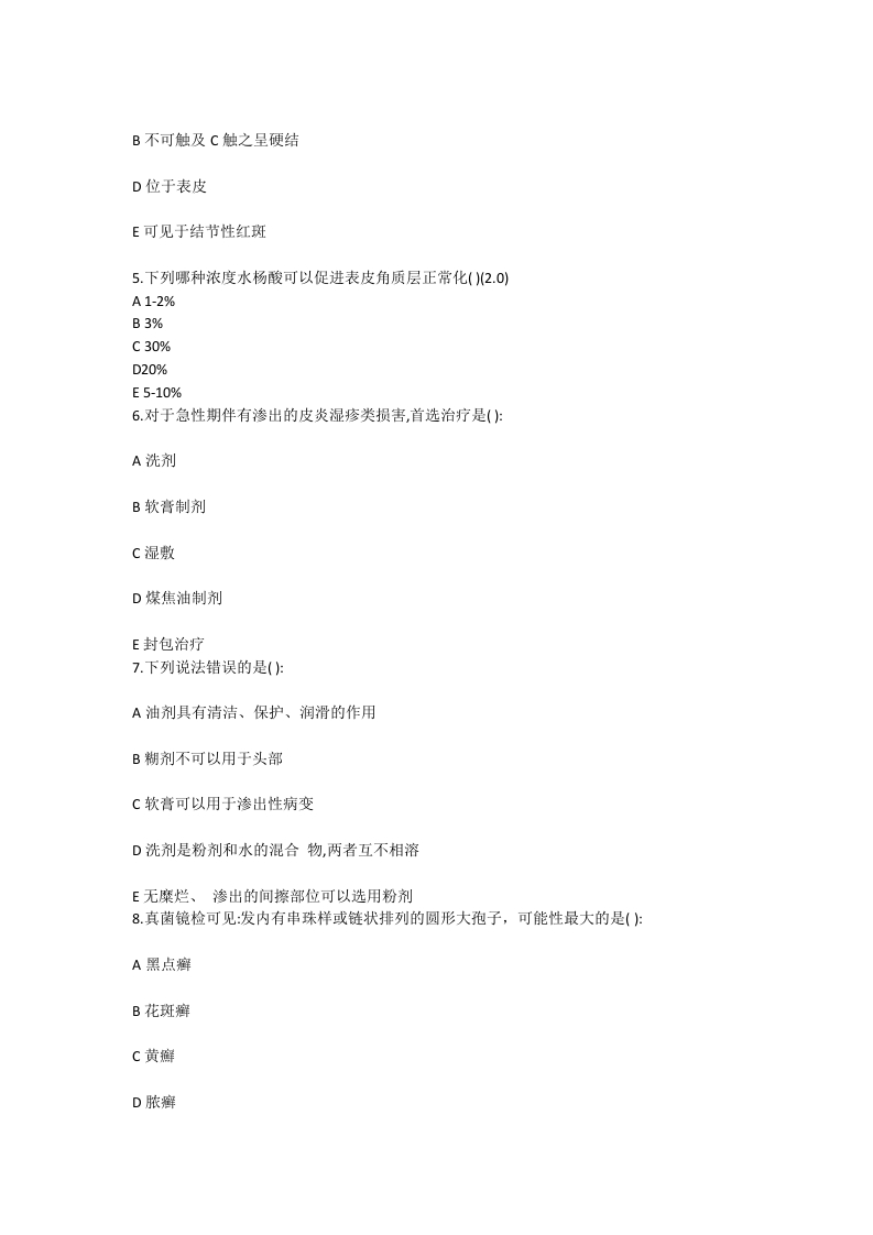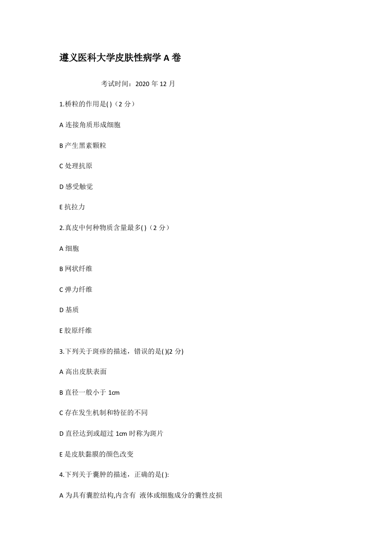 遵义医科大学皮肤性病学A卷考试时间:2020年12月1.桥粒的作用是()(2分)A连接角质形成细胞B产生黑素颗粒C处理抗原D感受触觉E抗拉力2.真皮中何种物质含量最多()(2分)A细胞B网状纤维C弹力纤维D基质E胶原纤维3.下列关于斑疹的描述,错误的是()2分)A高出皮肤表面B直径一般小于1cmC存在发生机制和特征的不同D直径达到或超过1cm时称为斑片E是皮肤黏膜的颜色改变4.下列关于囊肿的描述,正确的是()归A为具有囊腔结构,内含有液体或细胞成分的囊性皮损