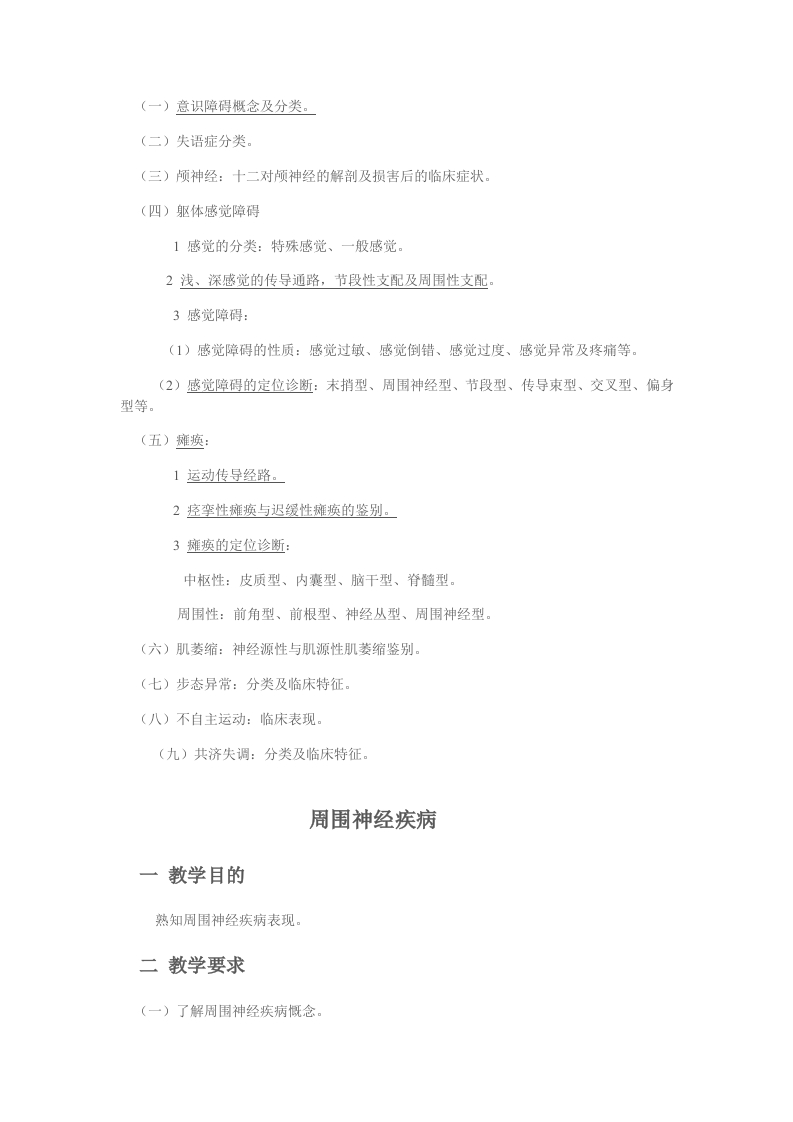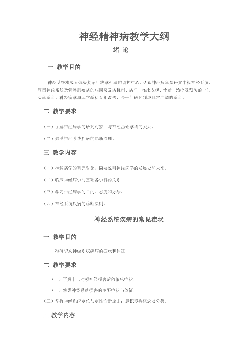 神经精神病教学大纲绪论一教学目的神经系统构成人体极复杂生物学机器的调控中心。认识神经病学是研究中枢神经系统、周围神经系统及骨骼肌疾病的病因及发病机制、病理、临床表现、诊断、治疗及预防的一门医学学科。神经病学与其它学科互相渗透,是一门研究领域非常广阔的学科。二教学要求(一)了解神经病学的研究对象,与神经基础学科的关系。(二)熟悉神经系统疾病的诊断原则。三教学内容(一)神经病学的研究对象,简要说明神经病学的发展史和未来。(二)临床神经病学与基础各学科的关系。(三)学习神经病学的目的、态度和方法。(四)神经系统疾病的诊断原则。神经系统疾病的常见症状一教学目的准确识别神经系统疾病的症状和体征。二教学要求(一)了解十二对颅神经损害后的临床症状。(二)熟悉神经系统损害的主要症状与体征。(三)掌握神经系统定位与定性诊断原则:意识障碍概念及分类。三教学内容