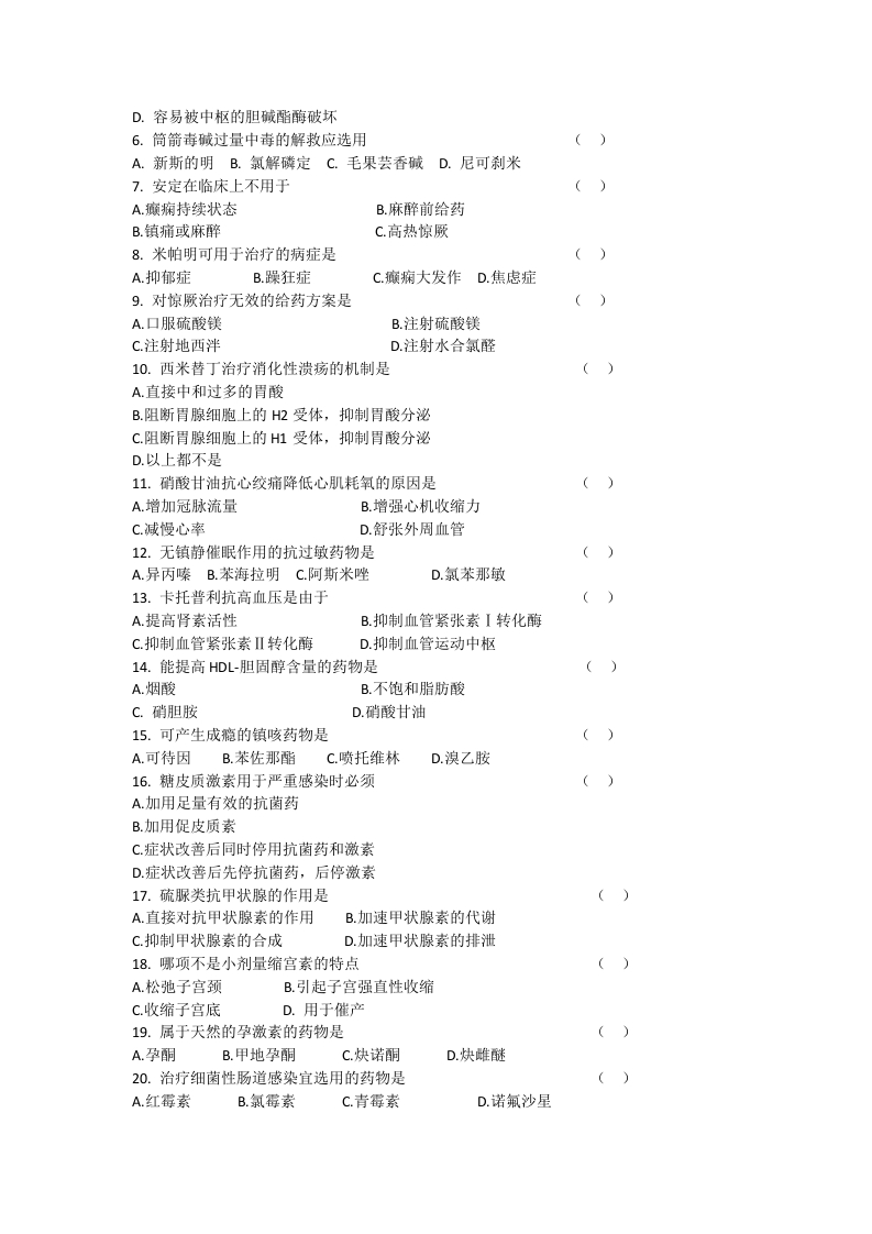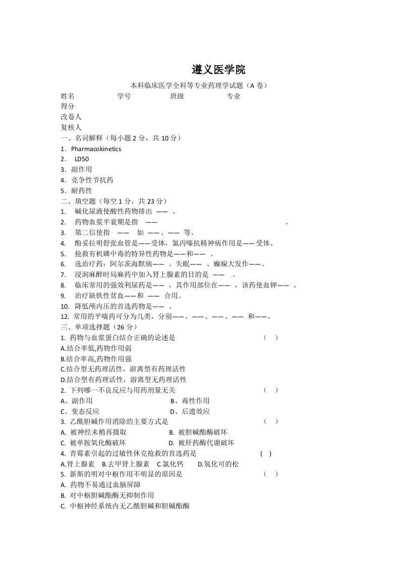 遵义医学院本科临床医学全科等专业药理学试题(A卷)姓名学号班级专业得分改卷人复核人一、名词解释(每小题2分,共10分)1.Pharmacokinetics2.D503.副作用4.竞争性节抗药5.耐药性二、填空题(每空1分,共23分)1.碱化尿液使酸性药物排出一一。2.药物血浆半衰期是指一一3.第二信使指一一如一一、一一等4.酚妥拉明舒张血管是一一受体,氯丙嗪抗精神病作用是一一受体。5.抢救有机磷中毒的特异性药物是一一和一一6。选治疗药:阿尔茨海默病一一、失眠一一、癫痫大发作一一。7.浸润麻醉时局麻药中加入肾上腺素的目的是一一8.临床常用的强效利尿药是一一,其作用部位在一一,该药使血钾一一。9.治疗缺铁性贫血一一和一一合用。10.降低颅内压的首选药物是一一12.常用的平喘药可分为几类,分别一一、一一、一一、一一和一一。三、单项选择题(26分)1.药物与血浆蛋白结合正确的论述是()A.结合率低,药物作用弱B.结合率高,药物作用强C结合型无药理活性,游离型有药理活性D.结合型有药理活性,游离型无药理活性2.下列哪一不良反应与用药剂量无关A、副作用B、毒性作用C、变态反应D、后遗效应3.乙酰胆碱作用消除的主要方式是A.被神经末梢再摄取B.被胆碱酯酶破坏C.被单胺氧化酶破坏D.被肝药酶代谢破坏4.青霉素引起的过敏性休克抢救的首选药是A.肾上腺素B.去甲肾上腺素C.氯化钙D.氢化可的松5.新斯的明对中枢作用不明显的原因是()A.药物不易通过血脑屏暗B.对中枢胆碱酯酶无抑制作用C.中枢神经系统内无乙酰胆碱和胆碱酯酶