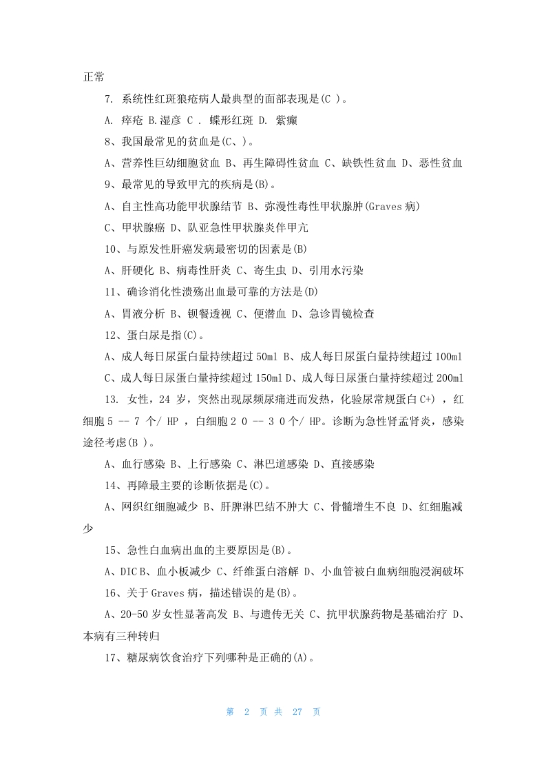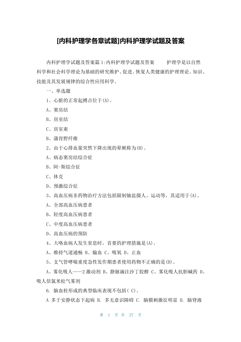 [内科护理学各章试题]内科护理学试题及答案内科护理学试题及答案篇1:内科护理学试题及答案护理学是以自然科学和社会科学理论为基础的研究维护、促进、恢复人类健康的护理理论、知识、技能及其发展规律的综合性应用科学。一、单选题1、心脏的正常起搏点位于()。A、窦房结B、房室结C、房室束B、蒲肯野纤维2、由于心排血量突然下降出现的晕厥称为(B)。A、病态窦房结综合症B、阿-斯综合征C、休克D、预激综合征3、高血压病非药物治疗方法包括限制轴盐摄人、运动等,其适用于(A)。A、全部高血压病患者B、轻度高血压病患者C、中度高血压病患者D、高血压病的预防4、大咯血病人发生室息时,首要的护理措施是(A)。A、维持气道通畅B、输血C、吸氧D、止血5、支气管哮喘重度急性发作期患者使用药物不正确的是(D)。A、雾化吸人一一2激动剂B、静脉滴注沙丁胶醇C、雾化吸人抗胆碱药D、吸人倍氯米松气雾剂6.脑血栓形成的典型临床表现不包括(C)。A多于安静状态下起病B.多无意识障碍C.脑膜剌激征明显D.脑脊液第1页共27页