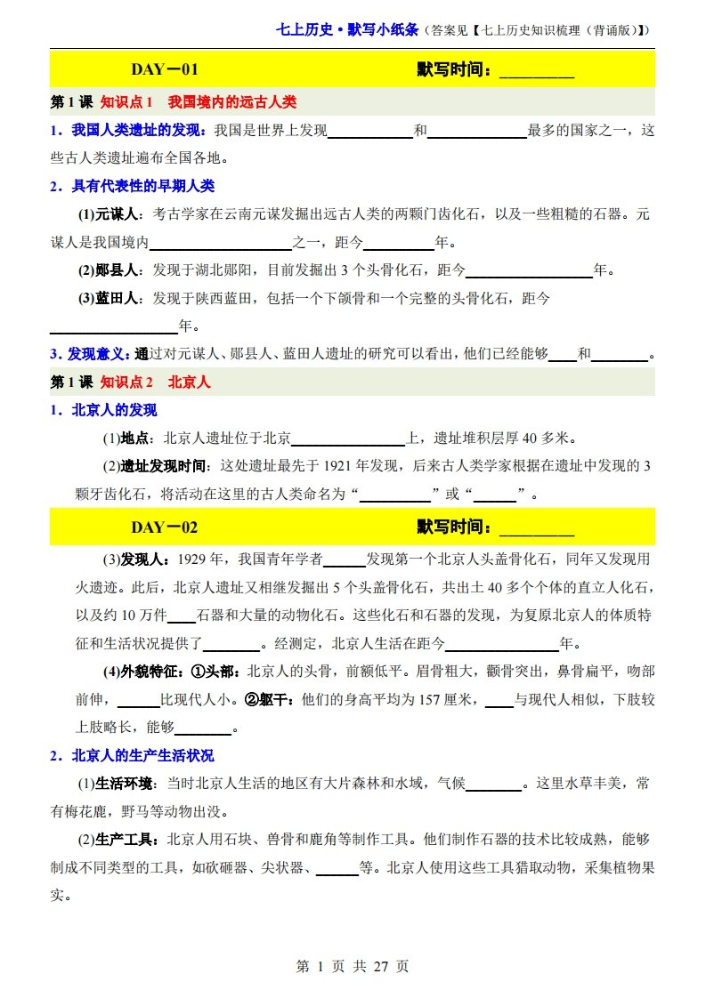 七上历史·默写小纸条(答案见【七上历史知识梳理(背诵版)】)DAY-01默写时间:第1课知识点1我国境内的远古人类1.我国人类遗址的发现:我国是世界上发现最多的国家之一,这些古人类遗址遍布全国各地。2.具有代表性的早期人类()元谋人:考古学家在云南元谋发掘出远古人类的两颗门齿化石,以及一些粗糙的石器。元谋人是我国境内之一,距今年。(2)那县人:发现于湖北那阳,目前发掘出3个头骨化石,距今年。(③)蓝田人:发现于陕西蓝田,包括一个下颌骨和一个完整的头骨化石,距今年。3.发现意义:通过对元谋人、那县人、蓝田人遗址的研究可以看出,他们已经能够和第1课知识点2北京人1.北京人的发现(1)地点:北京人遗址位于北京上,遗址堆积层厚40多米。(2)遗址发现时间:这处遗址最先于1921年发现,后来古人类学家根据在遗址中发现的3颗牙齿化石,将活动在这里的古人类命名为“”或“DAY-02默写时间:(3)发现人:1929年,我国青年学者」发现第一个北京人头盖骨化石,同年又发现用火遗迹。此后,北京人遗址又相继发掘出5个头盖骨化石,共出土40多个个体的直立人化石,以及约10万件石器和大量的动物化石。这些化石和石器的发现,为复原北京人的体质特征和生活状况提供了。经测定,北京人生活在距今年。(4)外貌特征:①头部:北京人的头骨,前额低平。眉骨粗大,颧骨突出,鼻骨扁平,吻部前伸,比现代人小。②躯干:他们的身高平均为157厘米,一与现代人相似,下肢较上肢略长,能够2.北京人的生产生活状况()生活环境:当时北京人生活的地区有大片森林和水域,气候。这里水草丰美,常有梅花鹿,野马等动物出没。(2)生产工具:北京人用石块、兽骨和鹿角等制作工具。他们制作石器的技术比较成熟,能够制成不同类型的工具,如砍砸器、尖状器、等。北京人使用这些工具猎取动物,采集植物果实。第1页共27页