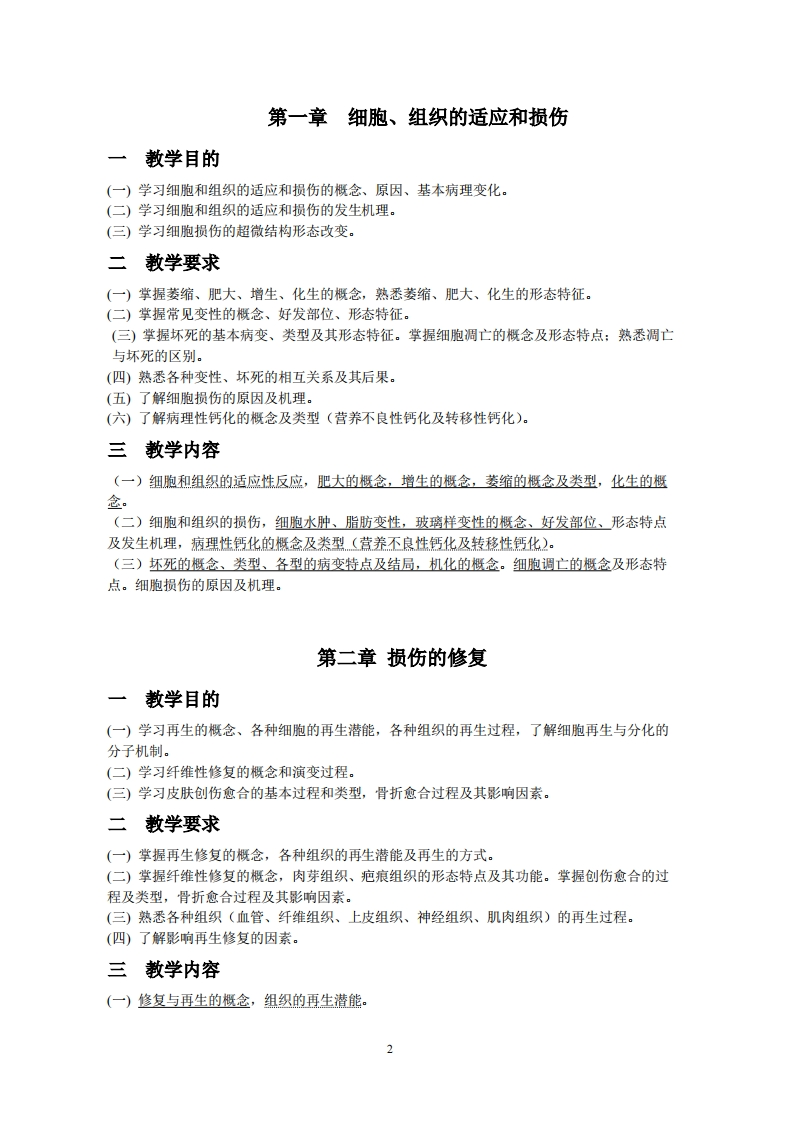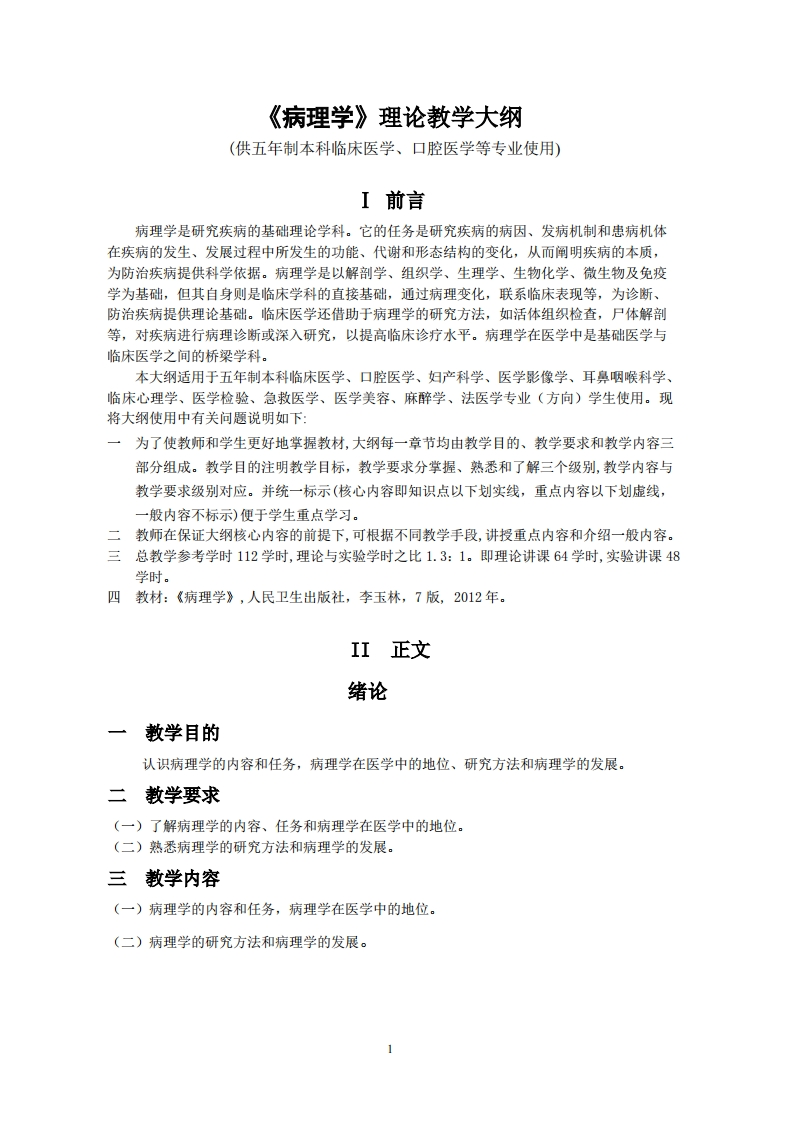 《病理学》理论教学大纲(供五年制本科临床医学、口腔医学等专业使用)I前言病理学是研究疾病的基础理论学科。它的任务是研究疾病的病因、发病机制和患病机体在疾病的发生、发展过程中所发生的功能、代谢和形态结构的变化,从而阐明疾病的本质,为防治疾病提供科学依据。病理学是以解剖学、组织学、生理学、生物化学、微生物及免疫学为基础,但其自身则是临床学科的直接基础,通过病理变化,联系临床表现等,为诊断、防治疾病提供理论基础。临床医学还借助于病理学的研究方法,如活体组织检查,尸体解剖等,对疾病进行病理诊断或深入研究,以提高临床诊疗水平。病理学在医学中是基础医学与临床医学之间的桥梁学科。本大纲适用于五年制本科临床医学、口腔医学、妇产科学、医学影像学、耳鼻咽喉科学、临床心理学、医学检验、急救医学、医学美容、麻醉学、法医学专业(方向)学生使用。现将大纲使用中有关问题说明如下:为了使教师和学生更好地掌握教材,大纲每一章节均由教学目的、教学要求和教学内容三部分组成。教学目的注明教学目标,教学要求分掌握、熟悉和了解三个级别,教学内容与教学要求级别对应。并统一标示(核心内容即知识点以下划实线,重点内容以下划虚线,一般内容不标示)便于学生重点学习。教师在保证大纲核心内容的前提下,可根据不同教学手段,讲授重点内容和介绍一般内容。总教学参考学时112学时,理论与实验学时之比1.3:1。即理论讲课64学时,实验讲课48学时。四教材:《病理学》,人民卫生出版社,李玉林,7版,2012年。II正文绪论教学目的认识病理学的内容和任务,病理学在医学中的地位、研究方法和病理学的发展。二教学要求(一)了解病理学的内容、任务和病理学在医学中的地位。(二)熟悉病理学的研究方法和病理学的发展。三教学内容(一)病理学的内容和任务,病理学在医学中的地位。(二)病理学的研究方法和病理学的发展。1