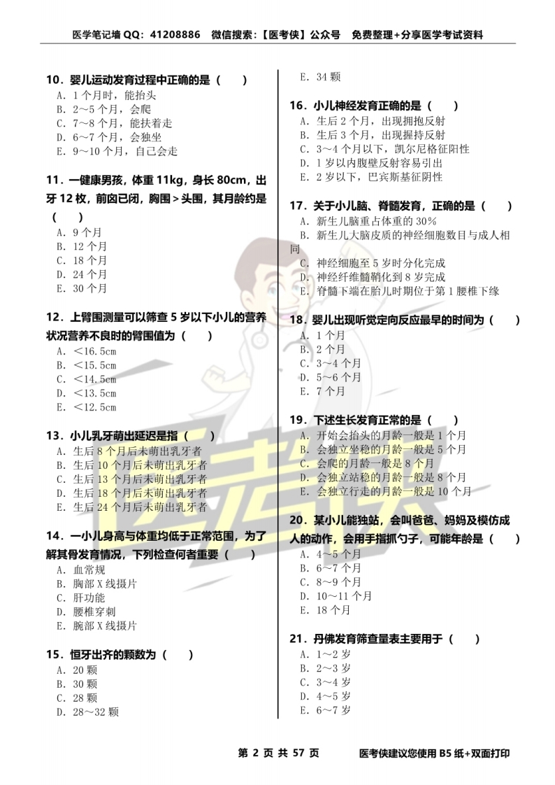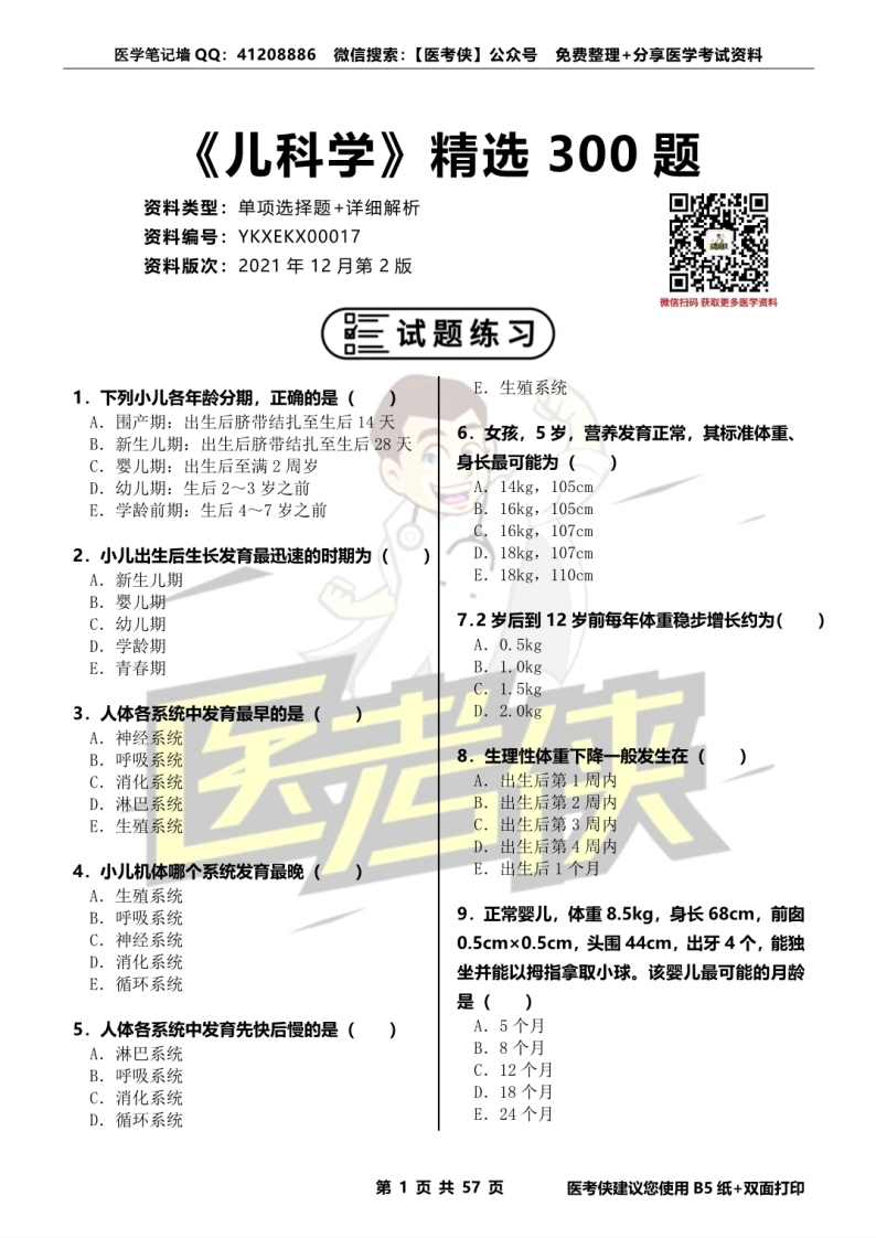 医学笔记墙QQ:41208886微信搜索:【医考侠】公众号免费整理+分享医学考试资料《儿科学》精选300题资料类型:单项选择题+详细解析▣▣资料编号:YKXEKX00017资料版次:2021年12月第2版微信扫码获取更多医学资料▣试题练习1.下列小)儿各年龄分期,正确的是(E.生殖系统A.围产期:出生后脐带结扎至生后14天6。女孩,5岁,营养发育正常,其标准体重、B.新生儿期:出生后脐带结扎至生后28天C.缨儿期:出生后至满2周岁身长最可能为()D.幼儿期:生后2一3岁之前A.14kg,105cmE.学龄前期:生后4一7岁之前B.16kg,105cmC.16kg,107cm2.小儿出生后生长发育最迅速的时期为(D.18kg,107cmA.新生儿期E.18kg,110cmB.婴儿期C.幼儿期7.2岁后到12岁前每年体重稳步增长约为(D.学龄期A.0.5kgE.青春期B.1.0kgC.1.5kg3.人体各系统中发育最早的是(D.2.0kgA.神经系统B.呼吸系统8.生理性体重下降一般发生在(C.消化系统A.出生后第1周内D.淋巴系统B.出生后第2周内E.生殖系统C.出生后第3周内D.出生后第4周内4.小儿机体哪个系统发育最晚(E.出生后1个月A.生殖系统B.呼吸系统9,正常婴儿,体重8.5kg,身长68cm,前囱C.神经系统0.5cm×0.5cm,头围44cm,出牙4个,能独D.消化系统E.循环系统坐并能以拇指拿取小球。该婴儿最可能的月龄是()5.人体各系统中发育先快后慢的是()A.5个月A.淋巴系统B.8个月B.呼吸系统C.12个月C.消化系统D.18个月D.循环系统E.24个月第1页共57页医考侠建议您使用B5纸+双面打印