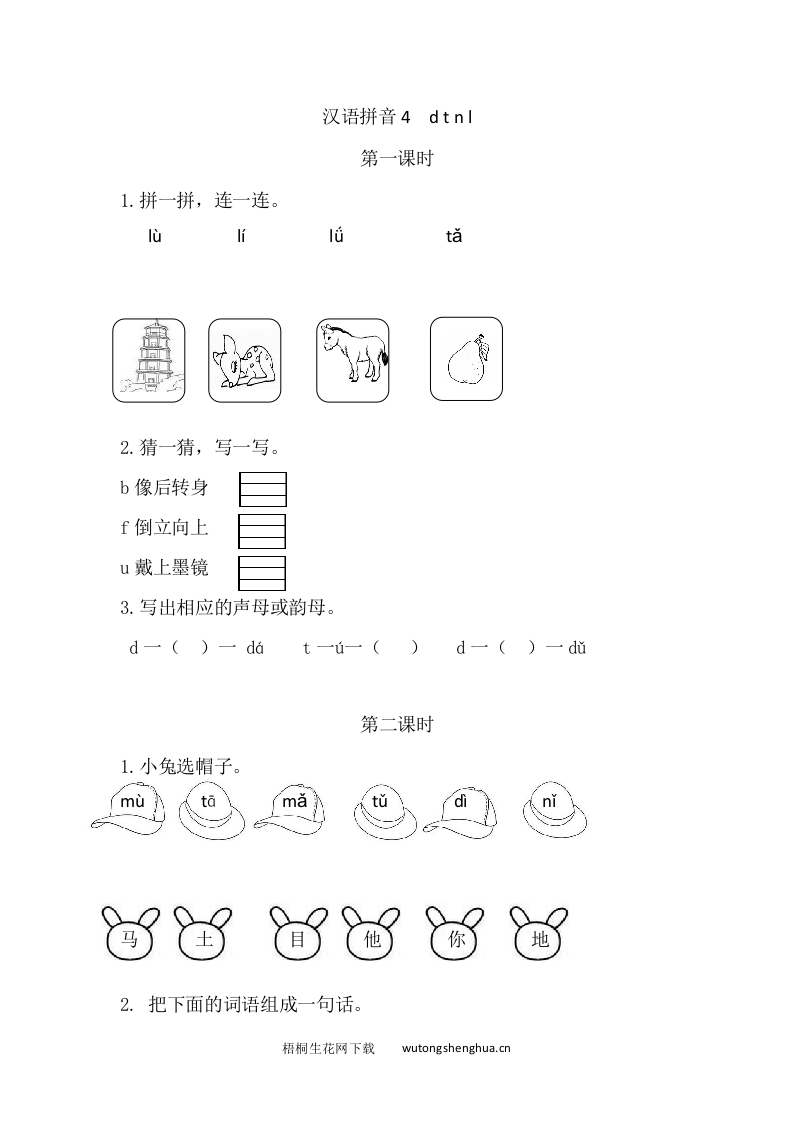 2021年部编版一年级语文上册第二单元课堂练习题及答案-汉语拼音4dtnl课时练qweryou25年10月20日发布关注私信0.27MB3页016713 第1页 / 共3页 该文档为免费文档,您可直接下载完整版进行阅读 © 版权声明文章版权归作者所有,转载请注明来源,未经允许请勿转载。本站内容均来自用户投稿或网络公开收集,本站只做展示,不对内容真实性负责。THE END文库文档 文本预览 汉语拼音4dtnl第一课时1.拼一拼,连一连。Iùilǘta2.猜一猜,写一写。b像后转身f倒立向上u戴上墨镜3.写出相应的声母或韵母。d一()一d6t一ú一()d一()一dǔ第二课时1.小兔选帽子。muta(matudi他你2.把下面的词语组成一句话。梧桐生花网下载wutongshenghua.cn 查看更多 收起部分 喜欢就支持一下吧点赞13 分享QQ空间微博QQ好友海报分享复制链接收藏