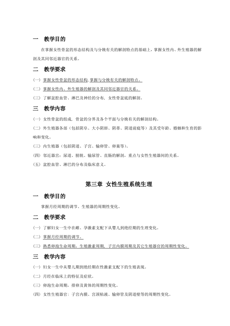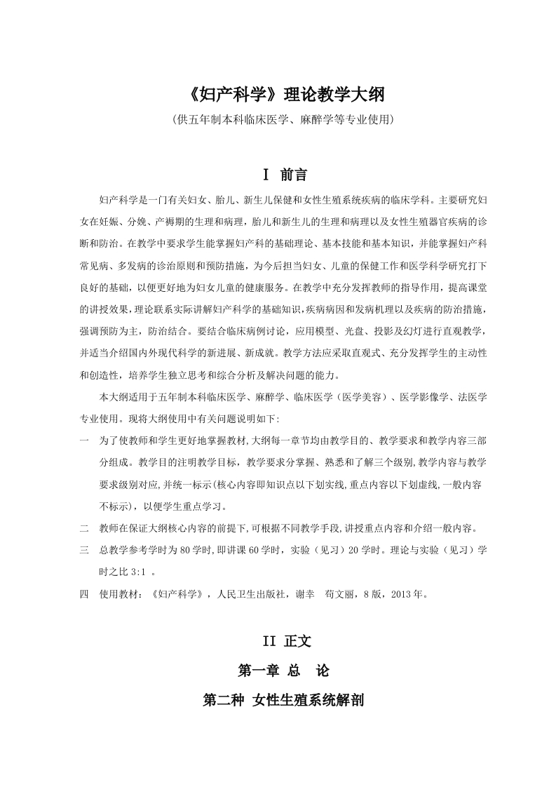 《妇产科学》理论教学大纲(供五年制本科临床医学、麻醉学等专业使用)I前言妇产科学是一门有关妇女、胎儿、新生儿保健和女性生殖系统疾病的临床学科。主要研究妇女在妊娠、分娩、产褥期的生理和病理,胎儿和新生儿的生理和病理以及女性生殖器宫疾病的诊断和防治。在教学中要求学生能掌握妇产科的基础理论、基本技能和基本知识,并能掌握妇产科常见病、多发病的诊治原则和预防措施,为今后担当妇女、儿童的保健工作和医学科学研究打下良好的基础,以便更好地为妇女儿童的健康服务。在教学中充分发挥教师的指导作用,提高课堂的讲授效果,理论联系实际讲解妇产科学的基础知识,疾病病因和发病机理以及疾病的防治措施,强调预防为主,防治结合。要结合临床病例讨论,应用模型、光盘、投影及幻灯进行直观教学,并适当介绍国内外现代科学的新进展、新成就。教学方法应采取直观式、充分发挥学生的主动性和创造性,培养学生独立思考和综合分析及解决问题的能力。本大纲适用于五年制本科临床医学、麻醉学、临床医学(医学美容)、医学影像学、法医学专业使用。现将大纲使用中有关问题说明如下:一为了使教师和学生更好地掌握教材,大纲每一章节均由教学目的、教学要求和教学内容三部分组成。教学目的注明教学目标,教学要求分掌握、熟悉和了解三个级别,教学内容与教学要求级别对应,并统一标示(核心内容即知识点以下划实线,重点内容以下划虚线,一般内容不标示),以便学生重点学习。二教师在保证大纲核心内容的前提下,可根据不同教学手段,讲授重点内容和介绍一般内容。三总教学参考学时为80学时,即讲课60学时,实验(见习)20学时。理论与实验(见习)学时之比3:1。四使用教材:《妇产科学》,人民卫生出版社,谢幸苟文丽,8版,2013年。II正文第一章总论第二种女性生殖系统解剖