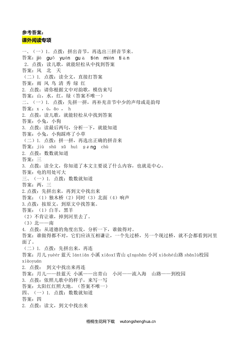 参考答案:课外阅读专项一、(一)1.点拨:拼出音节,再选出三拼音节来。答案:jia guǒyuan gu a tian mian ti an2.点拨:读儿歌,就能轻松从中找到答案答案:风北天(二)1.点拨:读全文,直接打答案答案:雨风鸟清秀绿红2.点拨:请你根据文中对韵歌,模仿来写答案:山,水,红,绿(答案不唯一)二、(一)1.点拨:先拼一拼,再补充音节中少的声母或是韵母答案:x,ù,do,h2.点拨:读儿歌,就能轻松从中找到答案答案:小兔,小狗3.点拨:读最后两句,分析一下,就能知道答案:小兔,小狗踩疼了小草(二)1.点拨:拼一拼,再选出正确的拼音来答案:jiùshuxǔhui gang chu2.点拨:数数就知道答案:三3.点拨:读全文,你知道了本文主要说了什么内容,也就是中心。答案:电的用处可大三、(一)1.点拨:数数就知道答案:两,三2.点拨:先拼出来,再到文中找出来答案:(1)独木桥(2)同时(3)北面(4)响声3.点拨:按原文,到原文中找答案。答案:(1)白羊,黑羊(2)不肯让谁,掉到河里去了。(3)北一一南4.点拨:从道德的角度出发,分析一下,谁做得对。答案:谁做得都不对,它们应该互相谦让,一个先过桥,另一个现过桥,就不会都看到河里面了。(二)1.点拨:先拼出来,再连答案:月儿yueer蓝天lantian小溪xiǎoxi青山qIngshan小河xiǎohé山路shanlù校园xiaoyuan2.点拨:到文中找出来再连答案:月儿一一挂蓝天小溪一一出青山小河一一流入海山路一一到校园3.点拨:依照儿歌中的样子,来写一写答案:太阳红红照大地。(答案不唯一)四、(一)1.点拨:数数就知道答案:四2.点拨:读文,到文中找出来悟桐生花网下载wutongshenghua.cn