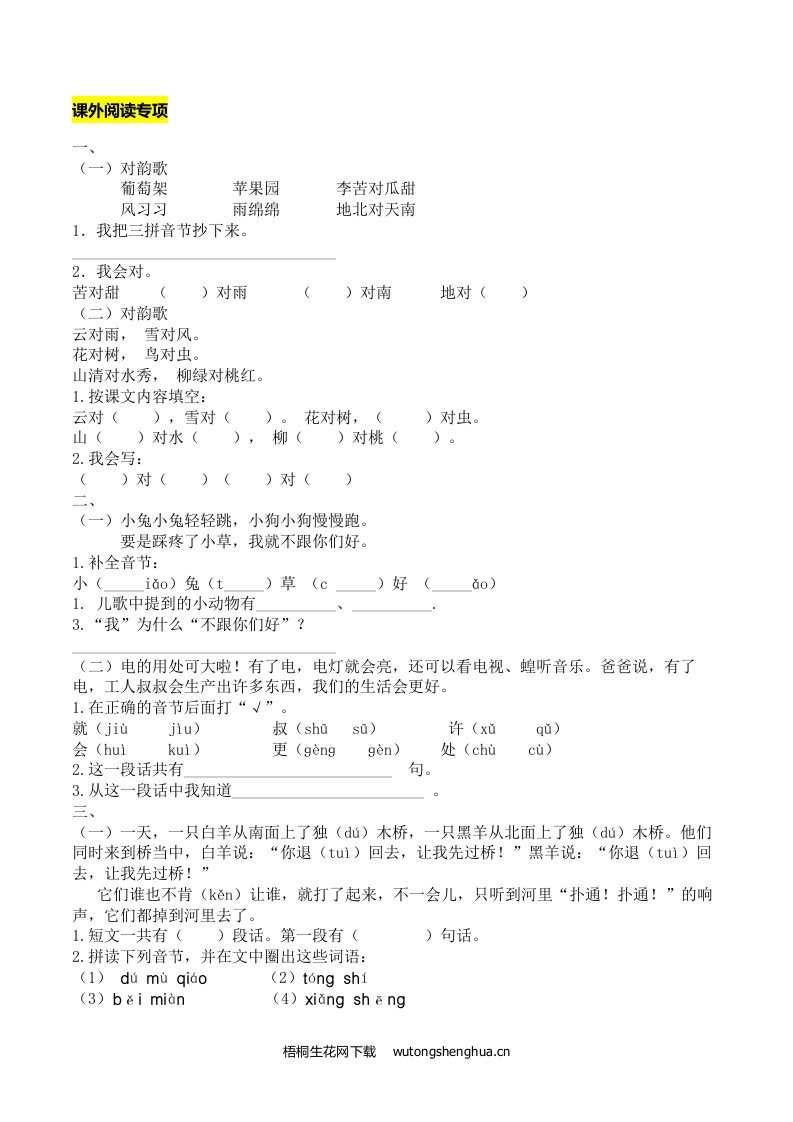 课外阅读专项一、(一)对韵歌葡萄架苹果园李苦对瓜甜风习习雨绵绵地北对天南1.我把三拼音节抄下来。2.我会对。苦对甜()对雨()对南地对()(二)对韵歌云对雨,雪对风。花对树,鸟对虫。山清对水秀,柳绿对桃红1.按课文内容填空:云对(),雪对()。花对树,()对虫。山()对水(),柳()对桃()。2.我会写:()对()()对()二、(一)小兔小兔轻轻跳,小狗小狗慢慢跑。要是踩疼了小草,我就不跟你们好。1.补全音节:小(iǎo)兔(t)草(c)好(ǎo)1.儿歌中提到的小动物有3.“我”为什么“不跟你们好”?(二)电的用处可大啦!有了电,电灯就会亮,还可以看电视、蝗听音乐。爸爸说,有了电,工人叔叔会生产出许多东西,我们的生活会更好。1.在正确的音节后面打“√”就(jiùjiu)叔(shds0)许(xǔqǔ)会(huikui)更(genggen)处(chùcù)2.这一段话共有句。3.从这一段话中我知道三、(一)一天,一只白羊从南面上了独(dú)木桥,一只黑羊从北面上了独(dú)木桥。他们同时来到桥当中,白羊说:“你退(tu)回去,让我先过桥!”黑羊说:“你退(tu)回去,让我先过桥!”它们谁也不肯(kě)让谁,就打了起来,不一会儿,只听到河里“扑通!扑通!”的响声,它们都掉到河里去了。1.短文一共有()段话。第一段有()句话。2.拼读下列音节,并在文中圈出这些词语:(1)dimùqido(2)tong shi(3)běi mian(4)xiang sh ang梧桐生花网下载wutongshenghua.cn
