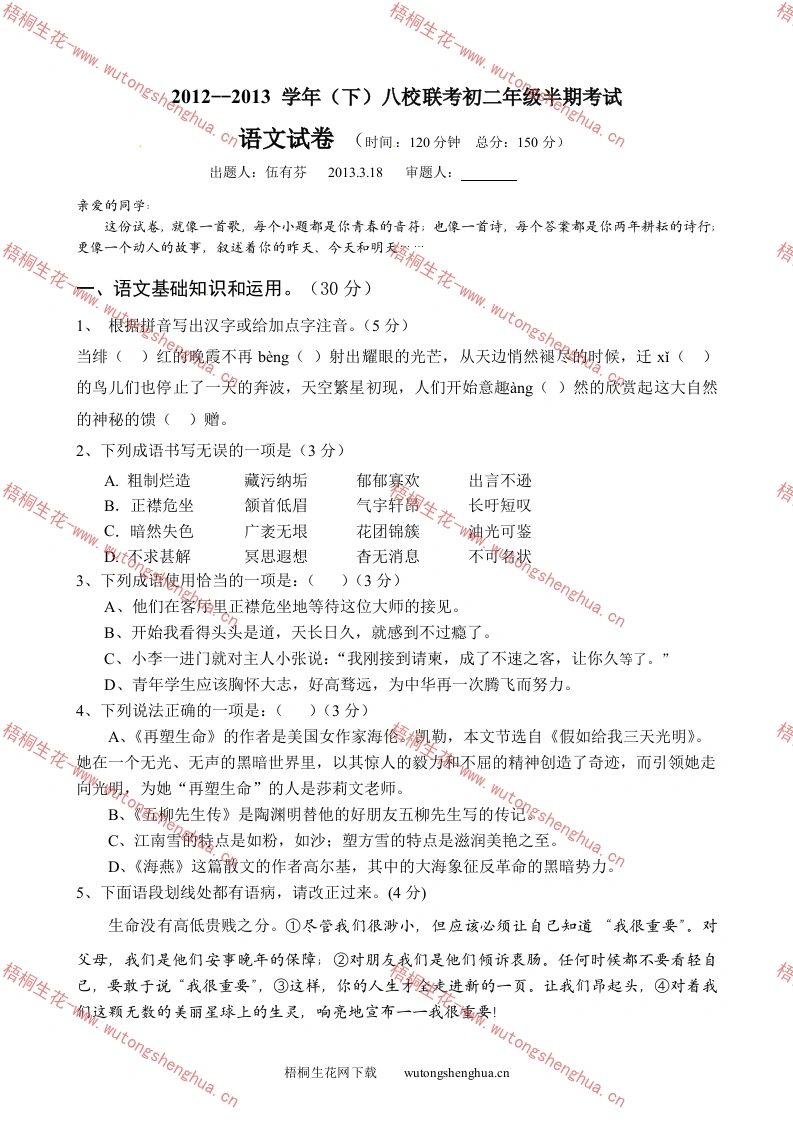 2012-2013学年(下)八校联考初二年级半期考试语文试卷(时间:120分钟总分:150分)出题人:伍有芬2013.3.18审题人:亲爱的同学:这份试卷,就像一首歌,每个小题都是你青春的音符;也像一首诗,每个答聚都是你两年耕耘的诗行:更像一个动人的故事,叙述着你的昨天、今天和明天……一、语文基础知识和运用。(30分)1、根据拼音写出汉字或给加点字注音。(5分)当绯()红的晚霞不再bèg()射出耀眼的光芒,从天边悄然褪尽的时候,迁xi()的鸟儿们也停止了一天的奔波,天空繁星初现,人们开始意趣ag()然的欣赏起这大自然的神秘的馈()赠。2、下列成语书写无误的一项是(3分)A.粗制烂造藏污纳垢郁郁寡欢出言不逊B.正襟危坐领首低眉气宇轩昂长吁短叹C.暗然失色广表无垠花团锦簇油光可鉴D.不求甚解冥思遐想杳无消息不可名状3、下列成语使用恰当的一项是:()(3分)A、他们在客厅里正襟危坐地等待这位大师的接见。B、开始我看得头头是道,天长日久,就感到不过瘾了。C、小李一进门就对主人小张说:“我刚接到请柬,成了不速之客,让你久等了。”D、青年学生应该胸怀大志,好高骛远,为中华再一次腾飞而努力。4、下列说法正确的一项是:()(3分)A、《再塑生命》的作者是美国女作家海伦。凯勒,本文节选自《假如给我三天光明》。她在一个无光、无声的黑暗世界里,以其惊人的毅力和不屈的精神创造了奇迹,而引领她走向光明,为她“再塑生命”的人是莎莉文老师。B、《五柳先生传》是陶渊明替他的好朋友五柳先生写的传记。C、江南雪的特点是如粉,如沙:塑方雪的特点是滋润美艳之至。D、《海燕》这篇散文的作者高尔基,其中的大海象征反革命的黑暗势力。5、下面语段划线处都有语病,请改正过来。(4分)生命没有高低贵贱之分。①尽管我们很渺小,但应该必须让自己知道“我很重要”。对父母,我们是他们安事晚年的保障;②对朋友我们是他们倾诉衷肠。任何时候都不要看轻自己,要敢于说“我很重要”,③这样,你的人生才全走进新的一页。让我们昂起头,④对着我们这颗无数的美丽星球上的生灵,响亮地宣布一一我很重要!梧桐生花网下载wutongshenghua..cn