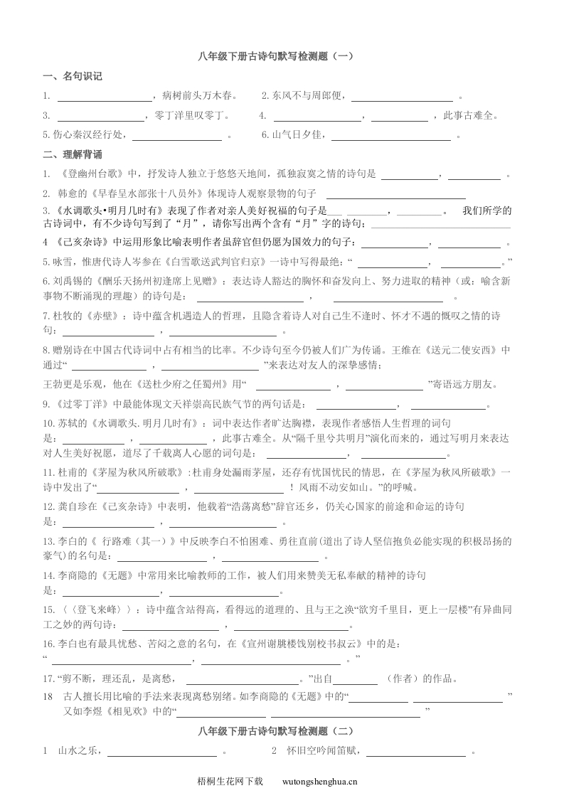 八年级下册古诗句默写检测题(一)一、名句识记1.病树前头万木春。2.东风不与周郎便,3.零丁洋里叹零丁。4.此事古难全。5.伤心秦汉经行处,6.山气日夕佳,二、理解背诵1.《登幽州台歌》中,抒发诗人独立于悠悠天地间,孤独寂寞之情的诗句是2.韩愈的《早春呈水部张十八员外》体现诗人观察景物的句子3.《水调歌头·明月几时有》表现了作者对亲人美好祝福的句子是我们所学的古诗词中,有不少诗句写到了“月”,请你写出两个含有“月”字的诗句:4《己亥杂诗》中运用形象比喻表明作者虽辞官但仍愿为国效力的句子:5.咏雪,惟唐代诗人岑参在《白雪歌送武判官归京》一诗中写得最绝:“6.刘禹锡的《酬乐天扬州初逢席上见赠》:表达诗人豁达的胸怀和奋发向上、努力进取的精神(或:喻含新事物不断涌现的理趣)的诗句是:7.杜牧的《赤壁》:诗中蕴含机遇造人的哲理,且隐含着诗人对自己生不逢时、怀才不遇的慨叹之情的诗句:8.赠别诗在中国古代诗词中占有相当的比率。不少诗句至今仍被人们广为传诵。王维在《送元二使安西》中通过“”来表达对友人的深挚感情:王勃更是乐观,他在《送杜少府之任蜀州》用“”寄语远方朋友。9.《过零丁洋》中最能体现文天祥崇高民族气节的两句话是:10.苏轼的《水调歌头.明月几时有》:词中表达作者旷达胸襟,表现作者感悟人生哲理的词句是:,此事古难全。从“隔千里兮共明月”演化而来的,通过写明月来表达对人生美好祝愿,道尽了千载离人心愿的词句是:11.杜甫的《茅屋为秋风所破歌》:杜甫身处漏雨茅屋,还存有忧国忧民的情思,在《茅屋为秋风所破歌》一诗中发出了“!风雨不动安如山。”的呼喊。12.龚自珍在《己亥杂诗》中表明,他载着“浩荡离愁辞官还乡,仍关心国家的前途和命运的诗句是:13.李白的《行路难(其一)》中反映李白不怕困难、勇往直前(道出了诗人坚信抱负必能实现的积极昂扬的豪气)的名句是:14.李商隐的《无题》中常用来比喻教师的工作,被人们用来赞美无私奉献的精神的诗句是:15.(〈登飞来峰》〉:诗中蕴含站得高,看得远的道理的、且与王之涣“欲穷千里目,更上一层楼有异曲同工之妙的两句诗:16.李白也有最具忧愁、苦闷之意的名句,在《宣州谢朓楼饯别校书叔云》中的是:17.“剪不断,理还乱,是离愁”出自(作者)的作品。18古人擅长用比喻的手法来表现离愁别绪。如李商隐的《无题》中的“又如李煜《相见欢》中的八年级下册古诗句默写检测题(二)1山水之乐,2怀旧空吟闻笛赋,梧桐生花网下载wutongshenghua.cn