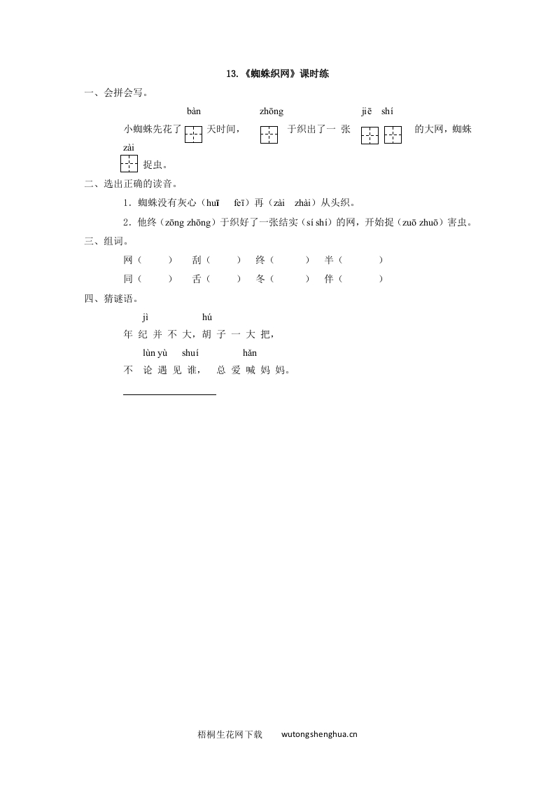13.《蜘蛛织网》课时练一、会拼会写。banzhongjiēshi小蜘蛛先花了天时间,于织出了一张图图的大网,蜘蛛zai图捉虫。二、选出正确的读音。l.蜘蛛没有灰心(hur fei)再(zai zhai)从头织。2.他终(zong zhδng)于织好了一张结实(sishi)的网,开始捉(zu心zhu心)害虫。三、组词。网()刮()终()半(同()舌()冬()伴(四、猜谜语。jihu年纪并不大,胡子一大把,lun yu shuihan不论遇见谁,总爱喊妈妈。梧桐生花网下载wutongshenghua.cn