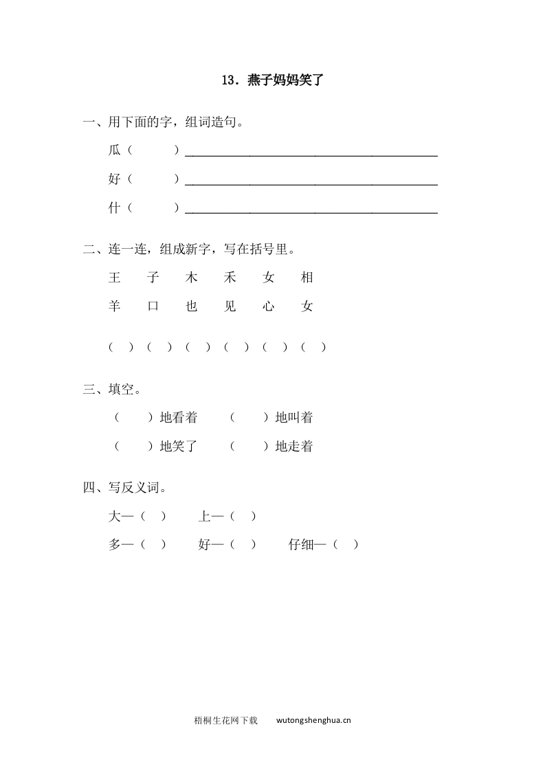 2017年语文版一年级语文下册课时练及答案-13.燕子妈妈笑了qweryou25年10月20日发布关注私信12KB2页0997 第1页 / 共2页 该文档为免费文档,您可直接下载完整版进行阅读 © 版权声明文章版权归作者所有,转载请注明来源,未经允许请勿转载。本站内容均来自用户投稿或网络公开收集,本站只做展示,不对内容真实性负责。THE END文库文档 文本预览 13.燕子妈妈笑了一、用下面的字,组词造句。瓜(好(什(二、连一连,组成新字,写在括号里。王子木禾女相羊口也见心女()()()()()()三、填空。()地看着()地叫着()地笑了()地走着四、写反义词。大一()上一()多一()好一()仔细一()梧桐生花网下载wutongshenghua.cn 查看更多 收起部分 喜欢就支持一下吧点赞7 分享QQ空间微博QQ好友海报分享复制链接收藏