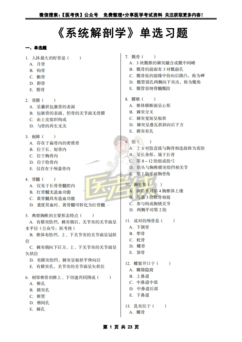 微信搜索:【医考侠】公众号免费整理+分享医学考试资料关注获取更多内容!《系统解剖学》单选习题一、单选题1.人体最大的籽骨是(7.骶骨()A.月骨A.3块骶椎的棘突融合成骶中间嵴B.钩骨B.骶骨的前面有5对骶前孔C.髌骨C.骶骨底的前缘中份向后隆凸,称为岬D.距骨D.骶管裂孔两侧向下突出,称为骶角E.骰骨E.骶管容纳脊髓骶段2.骨膜()8.腰椎())A.呈囊状包襄骨的表面A.椎体横断面呈心形B.包被骨的表面,但骨的关节面无骨膜B.棘突分叉C.由上皮组织构成C.棘突宽短呈板状D.与骨的再生无关D.棘突呈叠瓦状斜向后下方E.横突有孔3.板障()A.存在于扁骨内的密质骨9.肋()B.位于长、短骨内A.上6对肋直接与胸骨相连故称为真肋C.位于胸骨内B.呈长条形,属于长骨D.位于肋骨内C.第8~12肋组成肋弓E.仅存在于颅盖骨内D.肋头与胸椎横突肋凹相关节E.第2肋平对胸骨角4.骨髓()A.仅见于长骨骨髓腔内10:胸骨角已)B.红骨髓无造血功能A.向后平对第4胸椎体上缘C.黄骨髓具有造血功能B.与第3肋软骨相接D.重度贫血时,黄骨髓可转化为红骨髓C.参与构成胸锁关节D.两侧平对第2肋5.典型胸椎的主要形态特点(A.有横突肋凹,棘突朝后,关节突的关节面呈11.成对的颅骨是(水平位(公众号:医考侠)A.下颌骨B.椎体有肋凹,上、下关节突的关节面呈冠状B.犁骨位C.枕骨C.棘突朝向下后方,上、下关节突的关节面呈D.蝶骨矢状位E.顶骨D.有横突肋凹,棘突呈板状平伸向后12.蝶窦开口于(E.有横突孔,关节突的关节面呈矢状位A.蝶筛隐窝6.相邻椎骨的椎上、下切迹共同围成(B.上鼻道A.椎孔C.中鼻道中部B.横突孔D.中鼻道后部C.椎管E.下鼻道D.椎间孔E.棘孔13.乳突位于(A.蝶骨第1页共23页