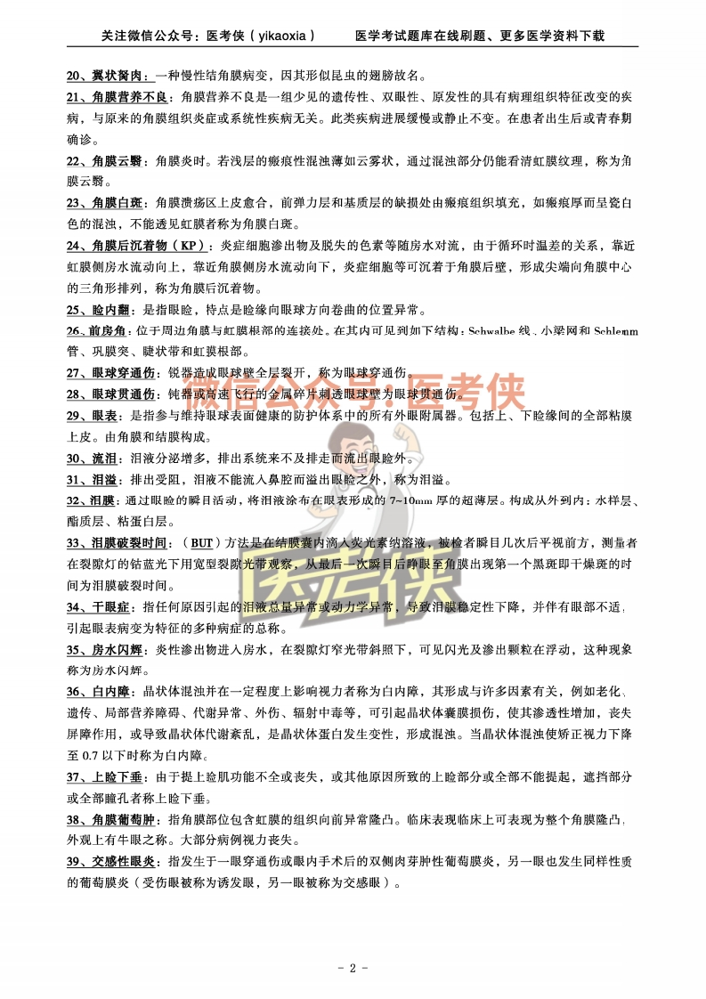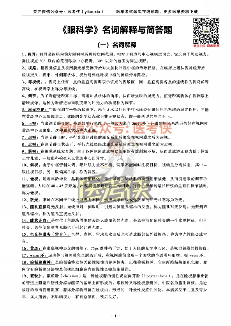 关注微信公众号:医考侠(yikaoxia)】医学考试题库在线刷题、更多医学资料下载《眼科学》名词解释与简答题(一)名词解释微信扫码题库刷1、视野:视野是指眼向前方固视时所见的空问范围,相对于视力的中心视锐度而言,它反映了周边视力。据注视点30°以内的范围称为中心视野,30°以外的范围为周边视野。2、视路:指视觉信息从视网膜光感受器开始对大脑枕叶视中枢的传导径路,在临床上指从视神经开妃,经视交叉、视束、外侧膝状体、视放射到枕叶视中枢的神经传导路径。3、等视线::视岛上任何一点的垂直高度即表示该点的视敏度,同一垂直高度各点的连线称为视岛的等高线,在视野学上称为等视线。4、调节:为了看清近距离目标,需增加晶状体的曲率,从而增强眼的屈光力,使近距离物体在视网膜上清晰成像,这种为看清近物而改变眼的屈光力的功能称为调节。3、屈光不正:当眼在调节松弛的状态下,来白3米以外的平行光线经过眼的屈光系统的屈光作用,不能在黄斑中心凹形成焦点,此眼的光学状态称为非正视状态,即一般所说的屈光不正。6、正视:当眼调节静业外界的罗行光线《般认为来自5以外上经眼的硒光系统后恰好在视网膜黄斑中心四案集,这种同秋态称为正褪从亏:医写史●7、远视:当调节静止时,平行光线经过眼的屈光系统后聚集在视网膜之后为远视。8、近视:在调节静止状态下,平行光线经眼球屈光系统后聚焦在视网膜之前为近视。9、弱视:在视觉系统发育期,由于各种原因造成视觉细胞的有效刺激不足,从而造成矫正视力低于同龄正常儿童,一般眼科检查未见黄斑中心凹异常。。10、斜视:由于中枢管俐失调,限外肌力量不平衡,两眼不能同时注视目标,视轴呈分离状态,其中一眼注视目标,另一眼偏离目标,称为斜视。11、老视:随着年龄增长,晶状体逐渐硬化,弹性诚弱,睫状肌的功能逐渐减低,从而引起眼的调节功能逐渐。大约在40-45岁开始,出现阅读等近距离工作困难,这种由于年龄增长所致的生理性调节减弱,称为老视。12、散光:眼球在不同子午线上屈光力不同,形成两条焦线或弥散斑的屈光状态称为散光。13、瞳孔直接对光反射:光线照射一侧眼时,引起两侧瞳孔缩小的反应,称为瞳孔对光反射。光照侧的瞳孔缩小,称为瞳孔直接光反射。14、睫状充血:是指位于角膜缘周围的表层巩膜血管的充血,是急性前葡萄膜炎的一个常见体征,但角膜炎、急性闭角型青光眼也可引起此种充血。15、电光性眼炎(雪直):电焊、高原、雪地及水面反光可造成眼部紫外线损伤,称为电光性眼炎或雪盲。16、黄斑:在眼底视神经盘的颗侧8、75px处并稍下方,处于人眼的光学中心区,是视力轴线的投影线。l7、weiss环:玻璃体与视网膜完全脱离开后,在视网膜前出现一个絮状的半透明环形物,标weiss环。18、脸板腺囊肿:是睑板腺特发性无菌性慢性肉芽肿性炎,以往称霰粒肿。它由纤维结缔组织包囊,囊内含有脸板腺分泌物及包括巨细胞在内的慢性炎症细胞浸润。l9、匿粒肿:霰粒肿(chalazion)是一种脸板腺的慢性炎症肉芽肿(lipogranuloma)。是在睑板腺排出管的管道上阻塞和脂性分泌物潴留的基础上而形成的。服粒肿又称脸板腺囊肿,中医名为胞生炎核。是检板腺的排出管道阻塞,腺体分泌物滞留在脸板内,形成的一种慢性炎症性肿物。本病多见于儿童及青少年,无大痛苦,不影响视力,有自愈倾向,预后良好。-1